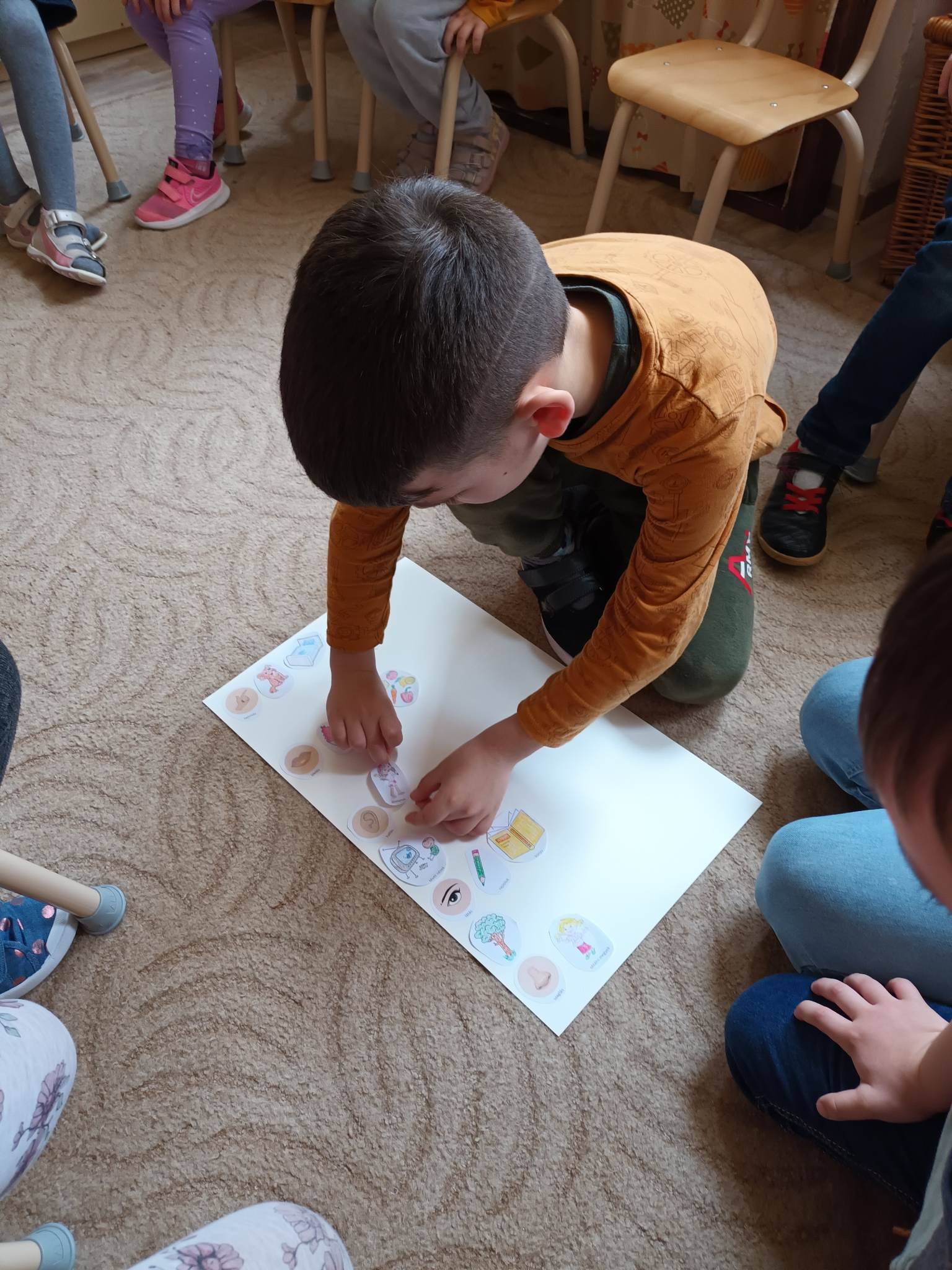 A foglalkozást az Imádok élni című Bagdi Bella dallal kezdeményeztem, amit kétszer is meghallgattunk. A következő játék a Hervad a virágom, éled a virágom… relaxációs gyakorlat volt. Ezt nagyon élvezték a gyerekek. A szőnyegre leültünk, és mindenki becsukta a szemét, majd kigondoltak egy-két olyan dolgot, amitől jól érzik magukat. Változatos dolgokat említettek („amikor anyával palacsintát sütünk”, amikor „kutyát simogatok”, stb.). Eztután Boldog Dóra érkezett hozzájuk. Rövid beszélgetést követően az Újra együtt című mesét hallgatták meg. Majd egy gyermeket kineveztünk „Örömkének”, és megbeszéltük, hogy Örömke mivel tudja érezni a jó dolgokat (érzékszervek). Elővettem egy táblát, amin az érzékszervek képei voltak. A beszélgetés közben fel is ragaszthatták a képeket (ha volt olyan), amiket az említett érzékszervvel éreznek. Itt is sokféle dolgot mondtak a gyerekek. Pl. „a nyelvünkkel érezzük, hogy finom a fagyi”, „a fülünkkel halljuk a madarak énekét”, „az orrával érezheti Örömke is mondjuk a parfümöt”, „a bőrünkkel érezzük, ha egy kiscica hozzánkbújik”. Valamint felfedezték, hogy egy-egy dolgot több érzékszervünkkel is érezhetünk. „A fát azt látjuk, és szép, mert virágzik, de jó illata is van, sőt, ha fújja a szél, akkor meg azt halljuk is”. A játék után mindenki lerajzolhatott egy vagy több dolgot, amitől boldog szokott lenni. „Akkor vagyok boldog, ha…”. és befejezték a mondatot, amikor bemutatták a rajzukat. A foglalkozást az Örömölelés játékkal zártuk. Majd mindenki felragasztotta a jelet a következő lépcsőfokra. Ezen a napon szép idő volt, így tettünk egy rövid sétát az óvoda körül. Közben a foglalkozáson említettekről beszélgettünk, mutatták a virágokat, felhőket, bogarakat, mondták a madárcsicsergést, valamint, hogy „az is egy apró öröm, hogy a barátom megfogta a kezem, és neki lehetek a párja”.