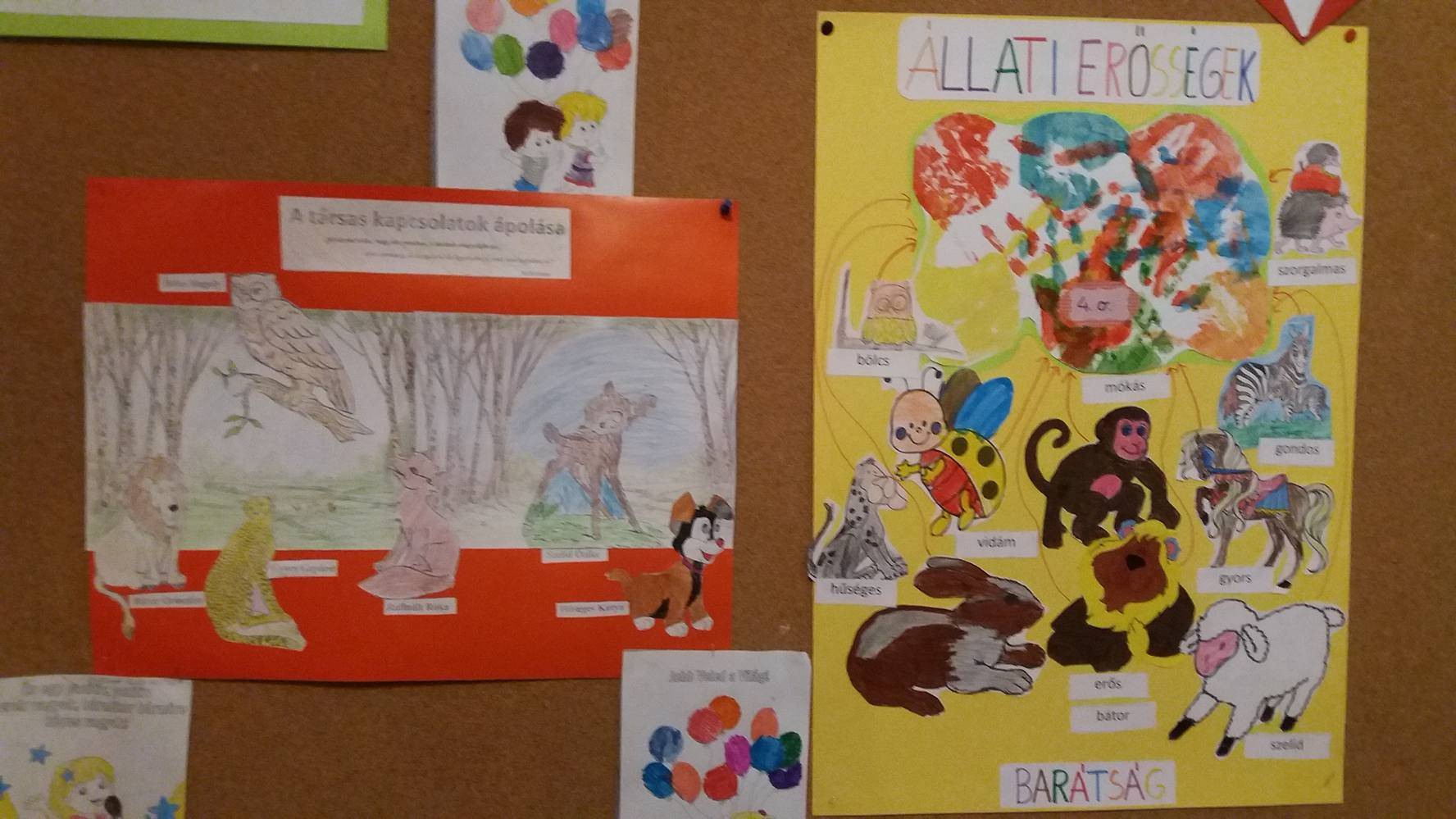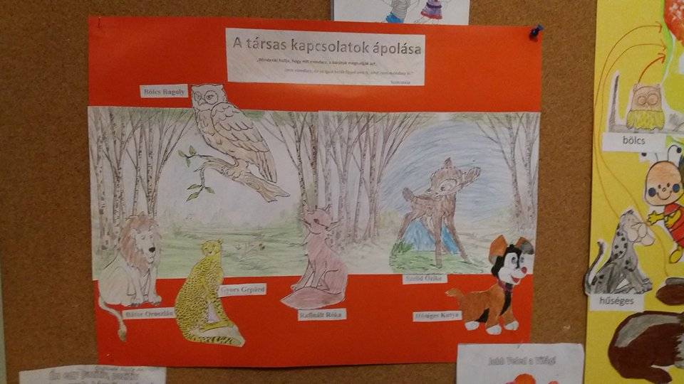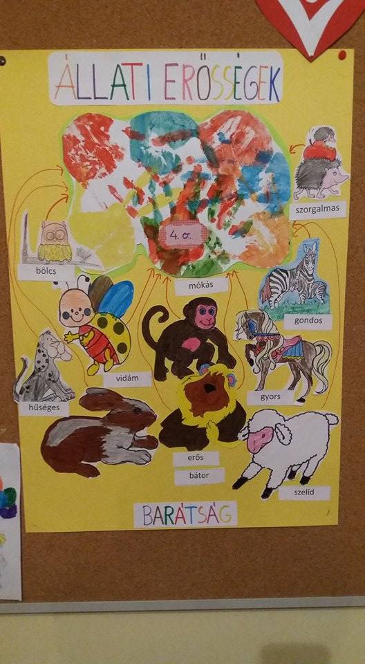 A harmonikus emberi kapcsolatok megteremtésről, fenntartásáról, a konfliktusok kezeléséről beszélgettünk. Az állati erősségek képek elkészítésénél, azt a szempontot vettük figyelembe, hogy az állatok mely tulajdonságai azok, melyek a harmonikus emberi kapcsolatokat segítik, melyekkel rendelkeznek a tanulók is. Az iskola összes tanulóját is bevontuk, ölelésnapot tartottunk, ahol lehetőségünk volt az egymás iránt érzett szeretet és hála gyakorlására, kifejezésére. Barátság-