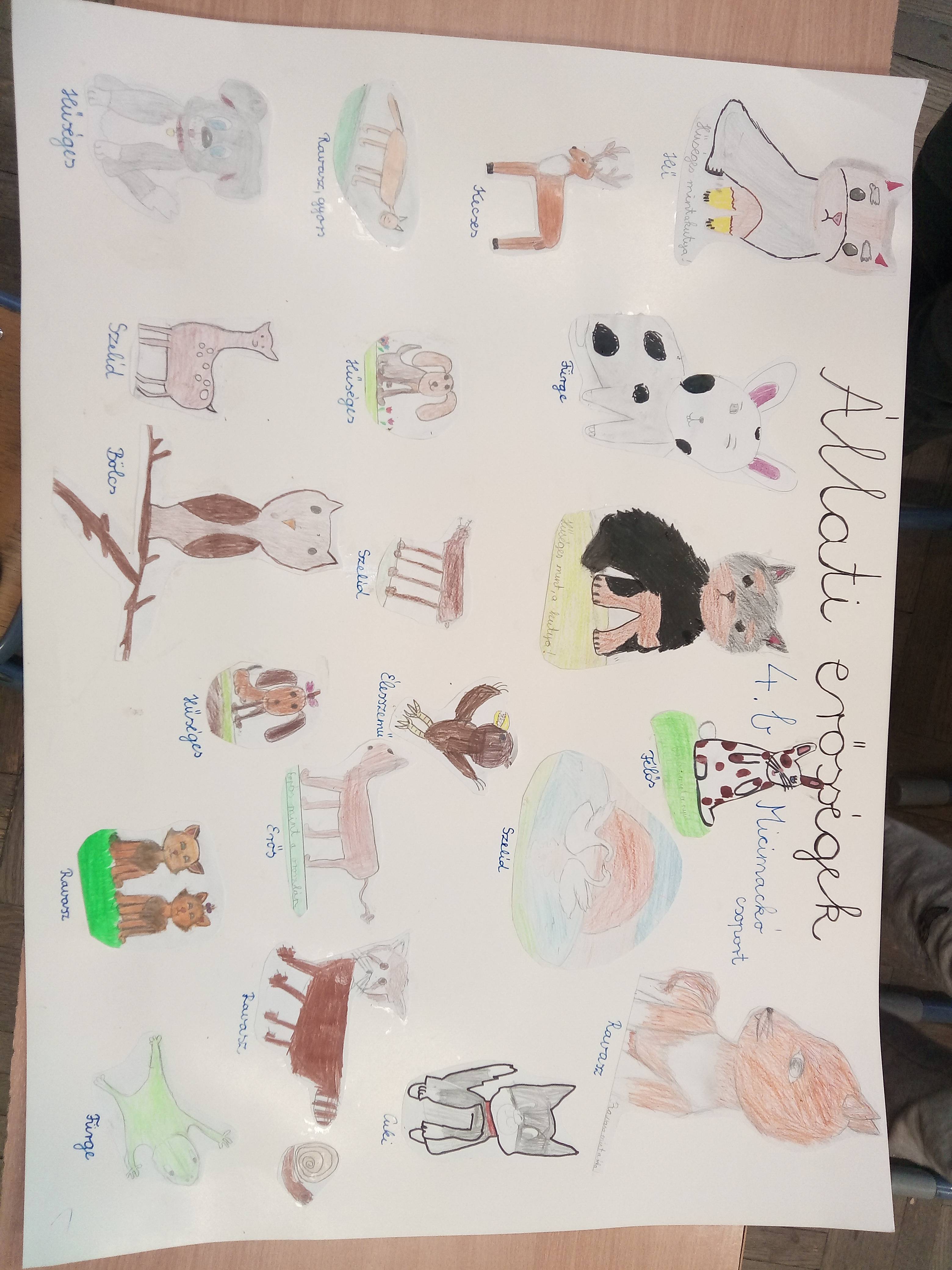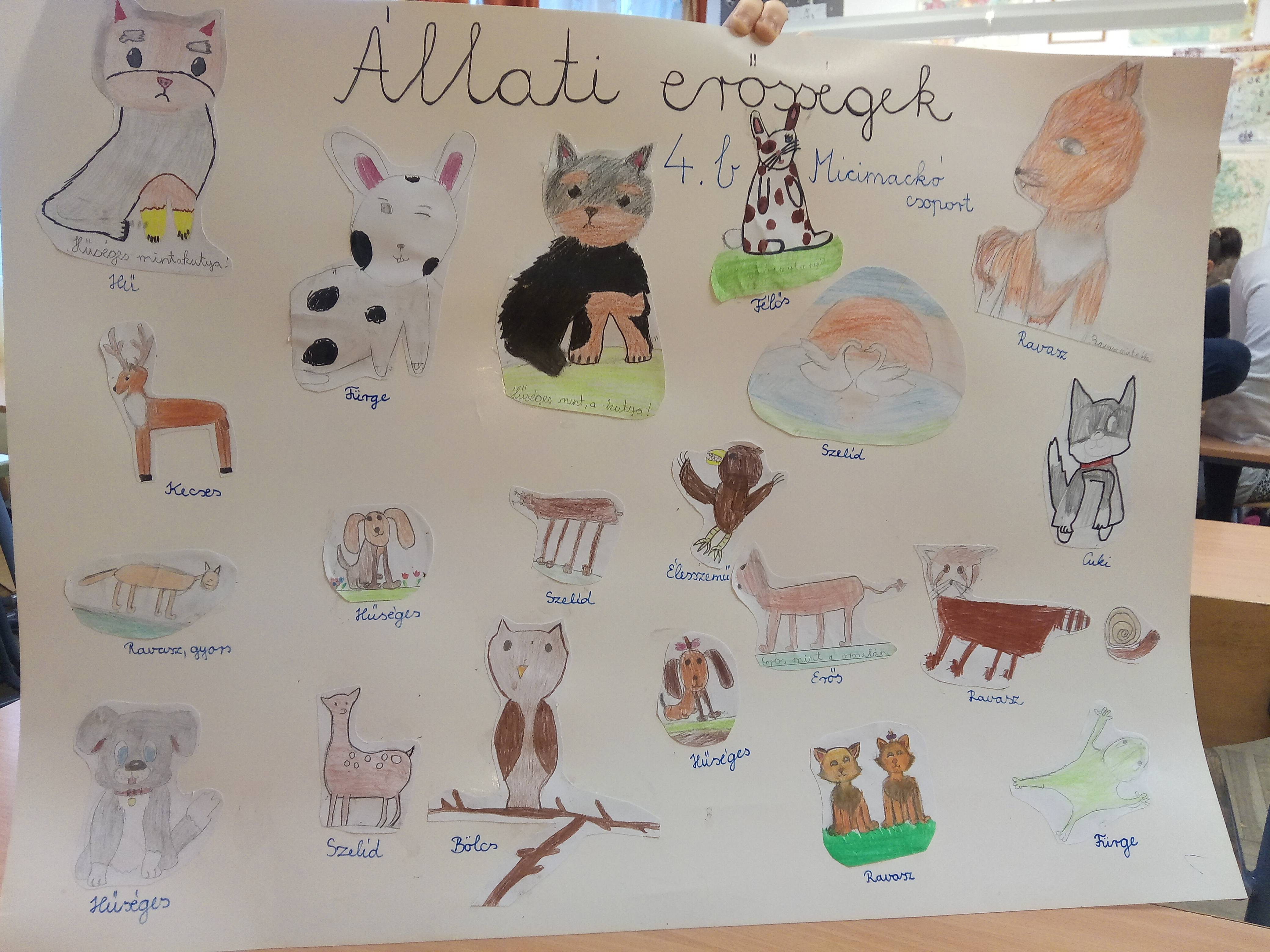A 3 megadott,feltöltendő feladat közül az Állati erősségek feladatot választottuk.A gyerekeknek olyan állatokat kellett rajzolni,melyek tulajdonságai jellemző a társas kapcsolatainkra is.Ebből készítettünk egy plakátot.