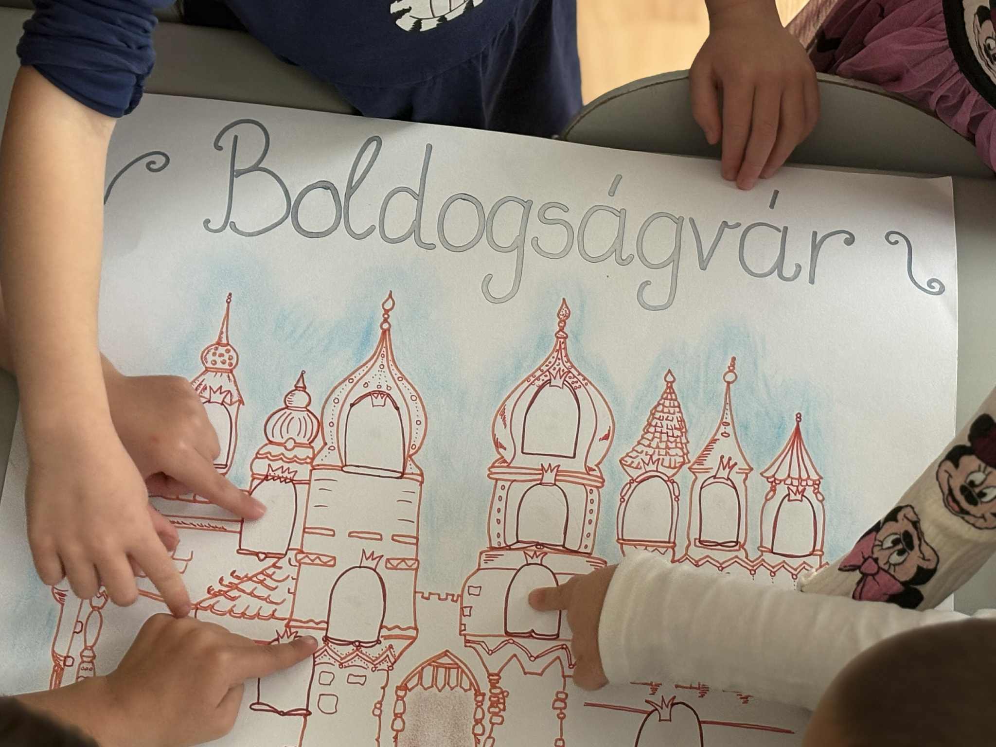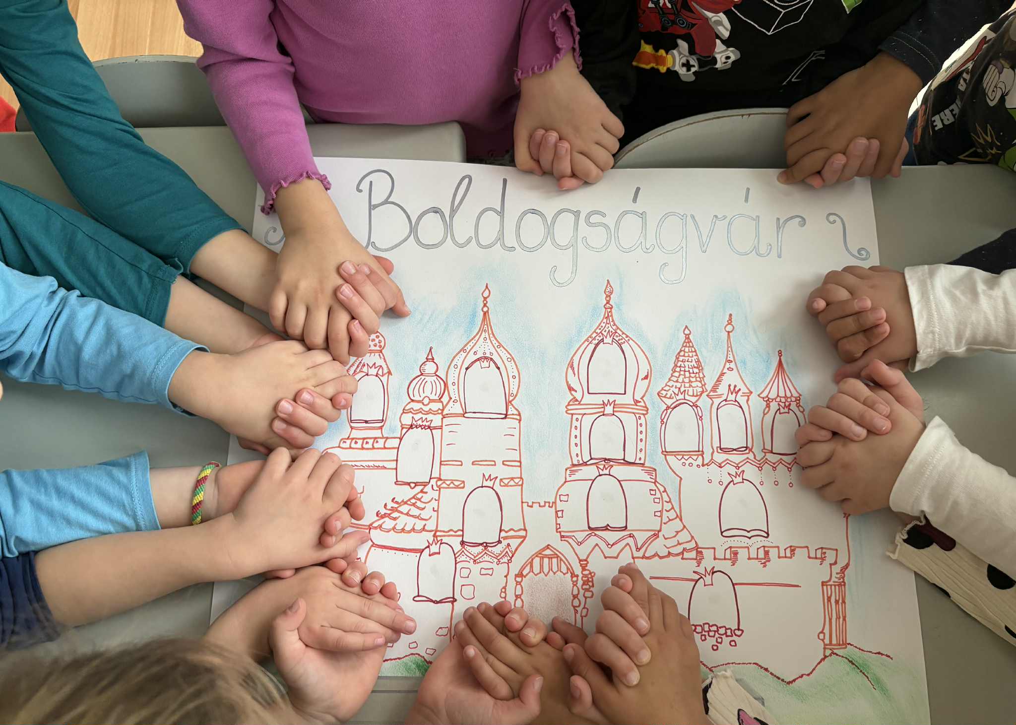 A foglalkozás lezárásaként a hála jelét felragasztottuk Boldogságvárunk első lépcsőfokára. A várat a csoportszoba falára ragasztottuk, így bármikor láthatják, bármikor vissza tudunk térni egy-egy beszélgetésre.
