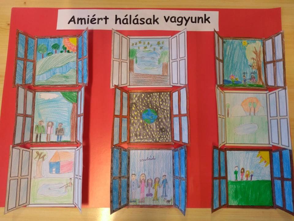 Az osztályban tanuló gyerekkel a háláról beszélgettünk. Összegyűjtöttük, hogy miért lehetünk hálásak életünk során. Elhangzottak többek között: a Föld, a természet, az állatok, a család, a barátok, az egészség. Ezután a tanulók kaptak egy ablak sablont. Azt kapták feladatul, hogy rajzolják le, hogy mit látnak, ha kinéznek a „hálaablakon”. Minden tanuló elkészítette a sajátját, majd ezek közül válogattunk s azok kerültek a közös műre.