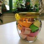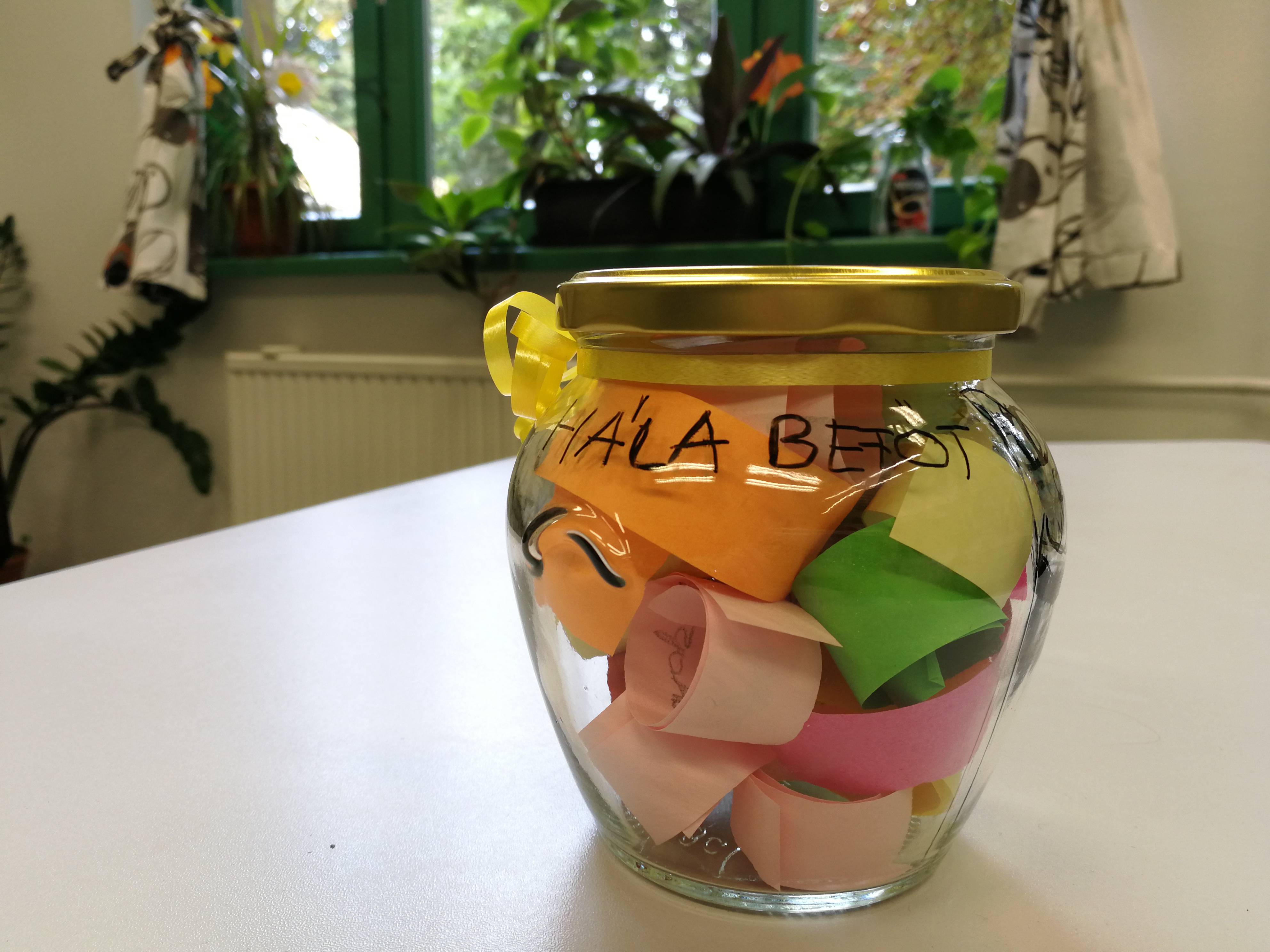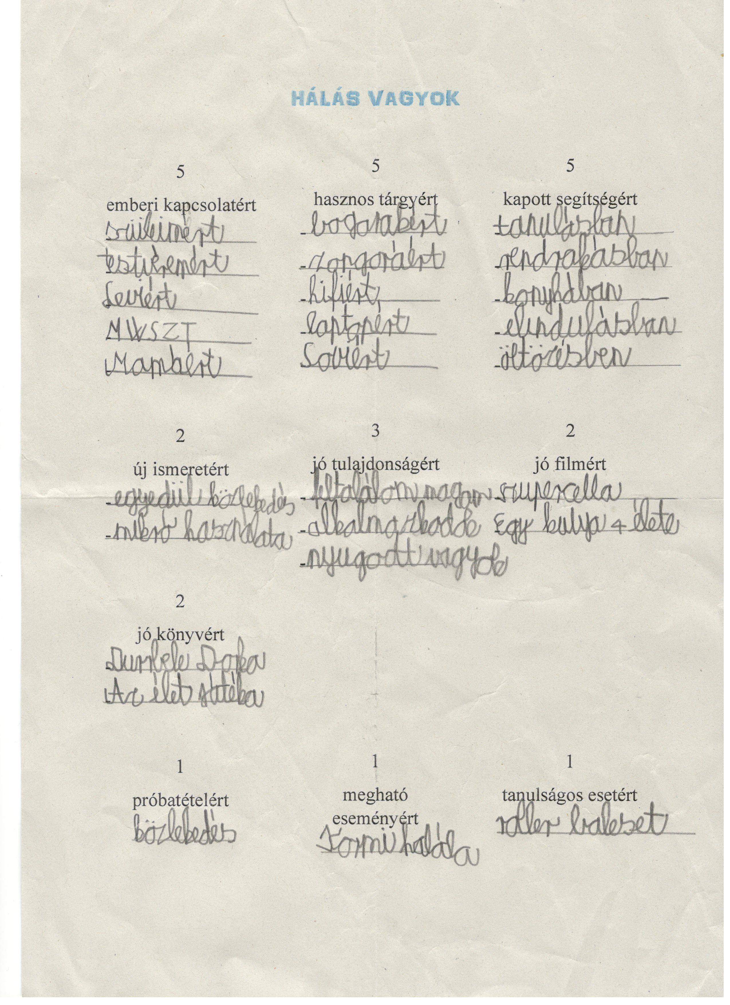 Meditációval kezdtük az első boldogság órát: halk relaxációs zene szólt és közben mondtam a meditációt segítő sorokat. Mikor ahhoz a részhez értem, hogy „anya szeret, apa szeret, biztonságban vagyok…” nem egy diáknak már folytak a könnyei a meghatottságtól. Ebben a kellemes, érzékeny, lágy hangulatban folytak az órák: beszélgettünk a háláról, történeteket meséltek, énekeltünk, elolvastuk a Csodakantár című mesét, rajzokat készítettek hozzá, szeretet kuponokat alkottak, hálabefőttet készítettünk, hálaforrásokat gyűjtöttek csokorba. A hála érzése csodálatos: nemcsak szeretetet alkot, hanem sokszorosítja azt. Láttuk egymás arcán, éreztük a levegőben…