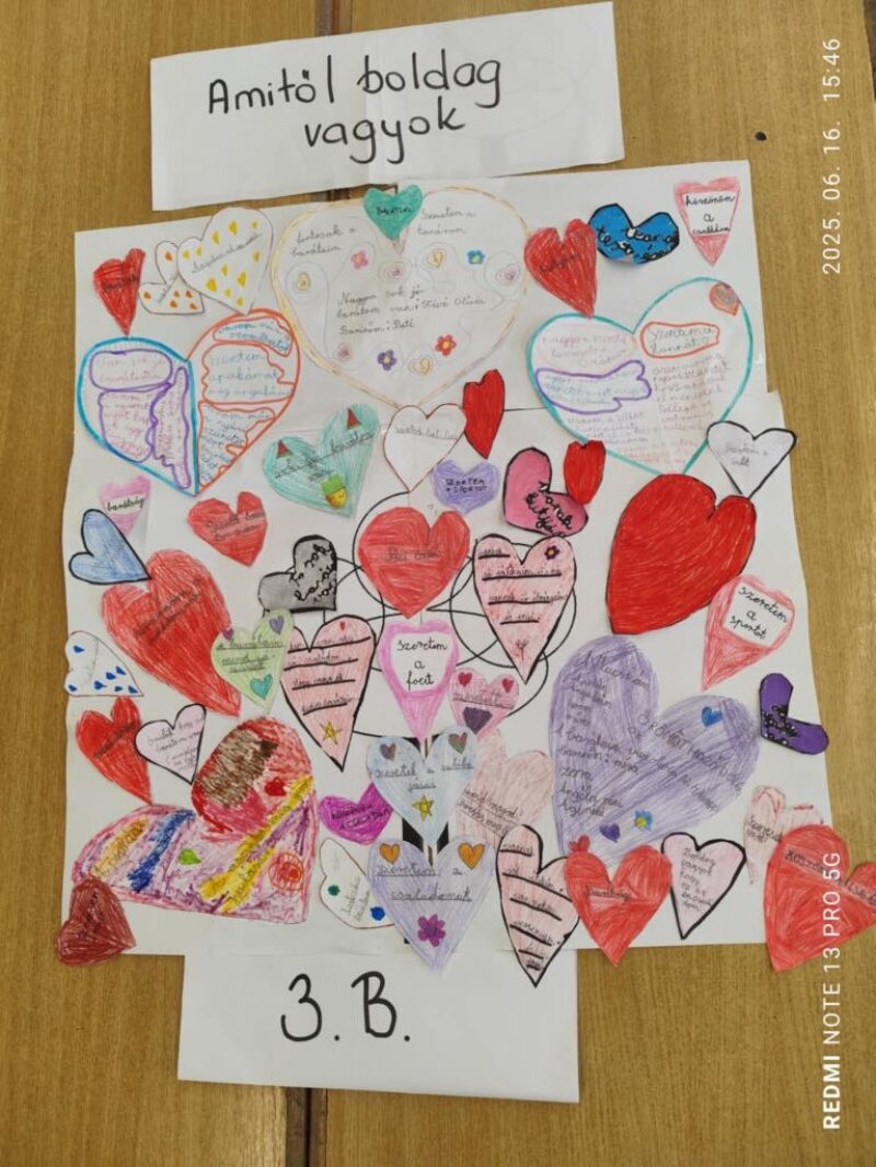 A gyerekekkel közösen gondolkodtunk arról, mit jelent az, hogy a boldogság nemcsak rövid távon, hanem hosszú távon is építhető, különösen akkor, ha odafigyelünk önmagunkra, egymásra és a környezetünkre. Az foglalkozás egyik központi eleme a közös alkotás volt: minden tanuló egy-egy szívecskére írta fel, hogy mi okoz neki örömet. A szivecskékből készült el a közös „Boldogságfa”, amely szimbolikusan is megmutatta, milyen sokféle dologból fakadhat boldogság – legyen az egy kedves szó, egy közös játék, egy ölelés, vagy épp a természetben töltött idő. A gyerekek őszinte és személyes válaszai – mint például „amikor együtt van a családom” vagy „amikor rajzolhatok” – megerősítették, hogy mennyire fontos szerepet játszanak az érzelmi kapcsolatok és az önkifejezés az öröm megélésében. Tanítóként különösen örültem annak, hogy az óra során az empátia és a kreativitás is hangsúlyosan jelen volt. A gyerekek figyeltek egymás gondolataira, örömmel mutatták meg saját szívecskéket, és nyitottan osztották meg érzéseiket. Úgy éreztem, hogy ez az alkalom nemcsak ismeretet adott, hanem egyfajta közösségi élményt is – mélyítve a kapcsolatokat és erősítve az osztályközösséget.