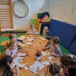 A beszélgetés után egy mesét mondtam a gyerekeknek, címe: A bátor nyuszi. Ezután kézműveskedtünk, nyuszit készítettünk vágással, ragasztással. Az elkészült nyuszikat egy közös képre ragasztották fel. Amíg dolgoztak, kérdeztem tőlük, hogy mivel bátorítanák a nyuszit, hogy ne féljen? Aranyos válaszok születtek: ” Ne félj a hangoktól, szellemektől nem bántanak!” ” Ne félj, légy bátor!” „Ne félj, te egy hős vagy!” ” Nem vagy egyedül, ott leszek mindig melletted!” „Szedd össze a bátorságodat!” „Mindig legyél bátor a többi nyuszi mellett!” „Ne félj!”