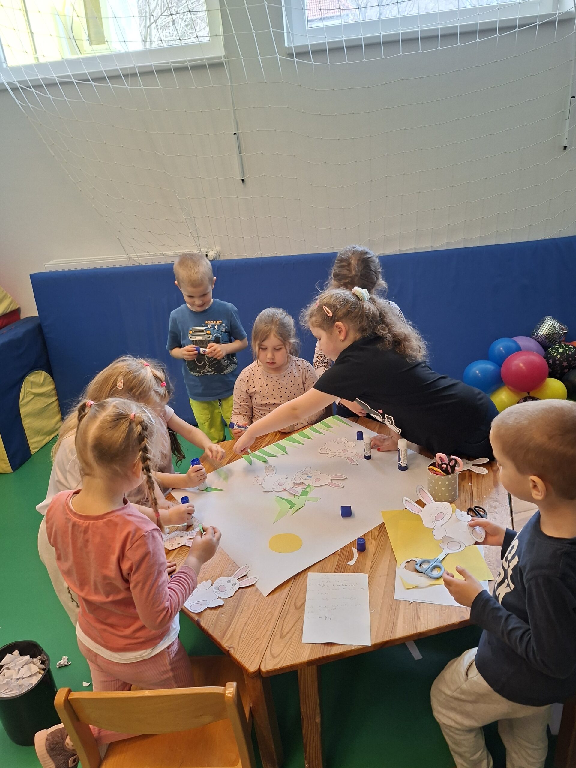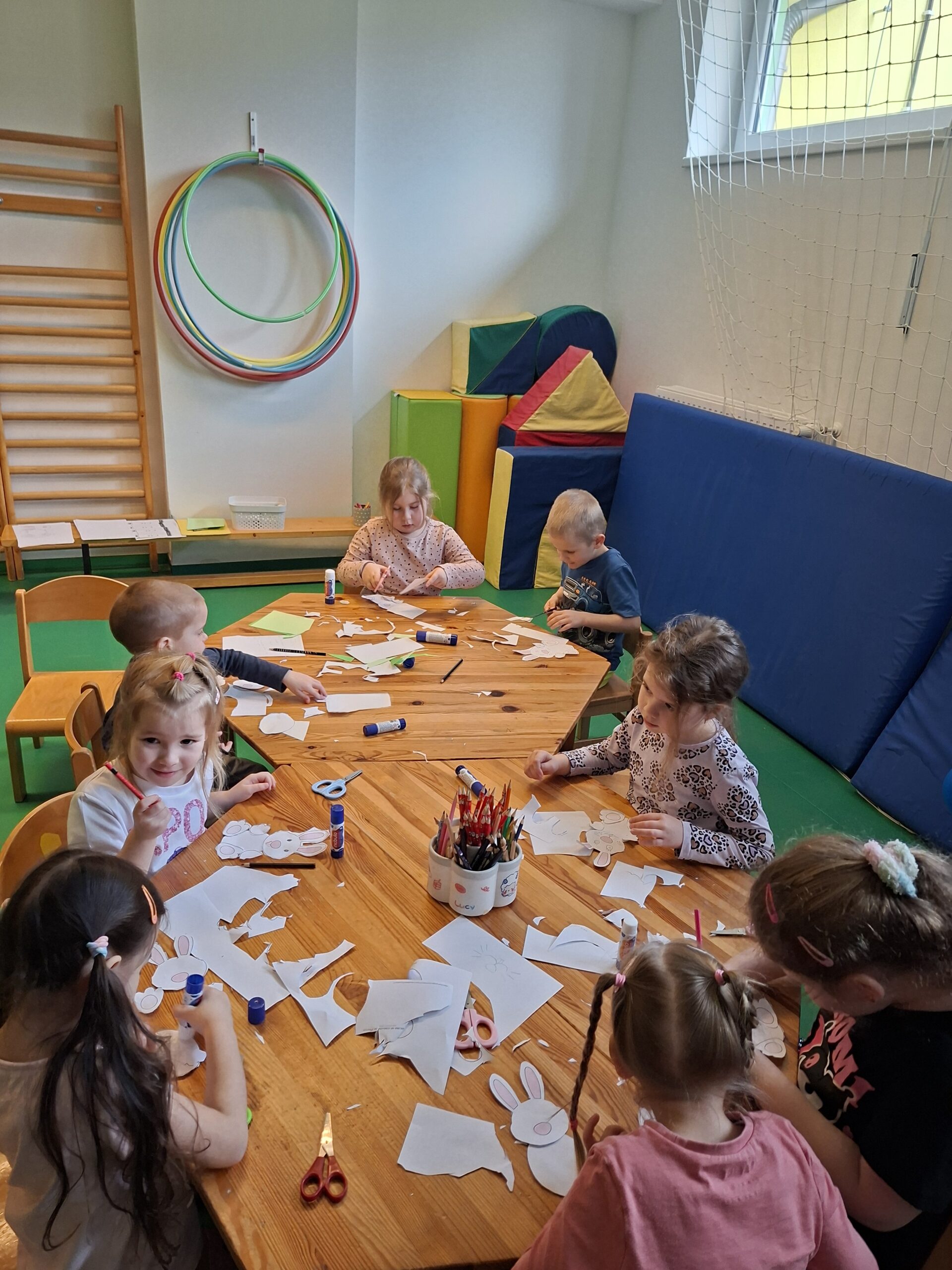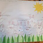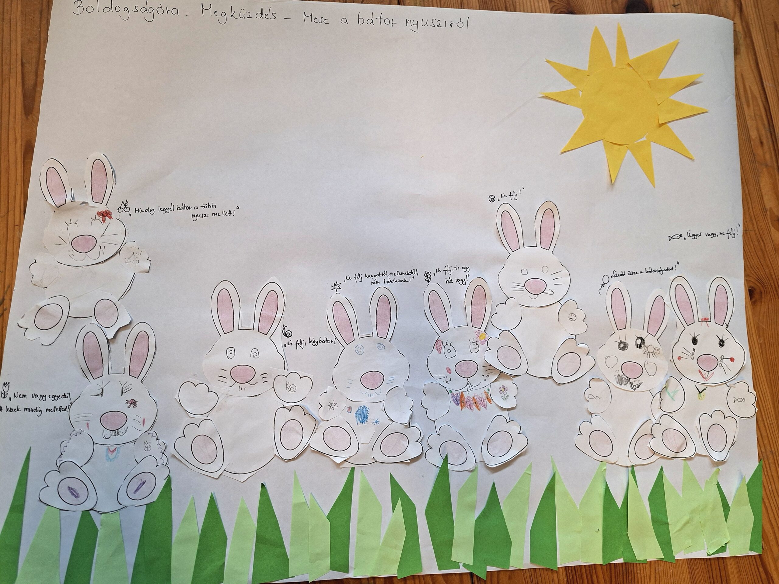 A beszélgetés után egy mesét mondtam a gyerekeknek, címe: A bátor nyuszi. Ezután kézműveskedtünk, nyuszit készítettünk vágással, ragasztással. Az elkészült nyuszikat egy közös képre ragasztották fel. Amíg dolgoztak, kérdeztem tőlük, hogy mivel bátorítanák a nyuszit, hogy ne féljen? Aranyos válaszok születtek: ” Ne félj a hangoktól, szellemektől nem bántanak!” ” Ne félj, légy bátor!” „Ne félj, te egy hős vagy!” ” Nem vagy egyedül, ott leszek mindig melletted!” „Szedd össze a bátorságodat!” „Mindig legyél bátor a többi nyuszi mellett!” „Ne félj!”