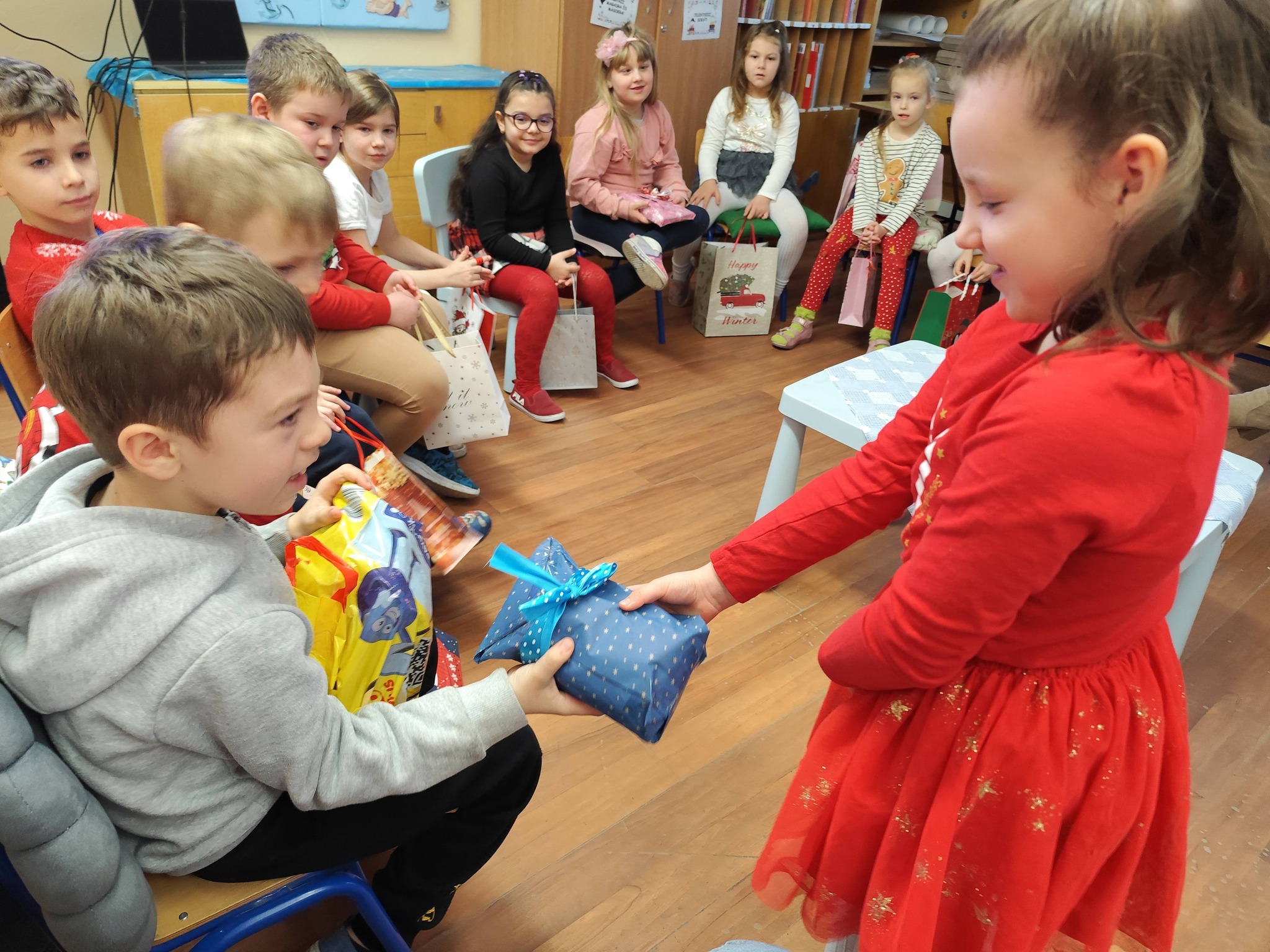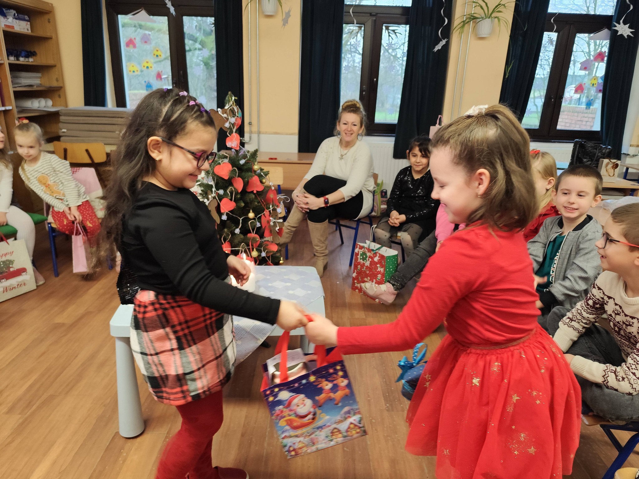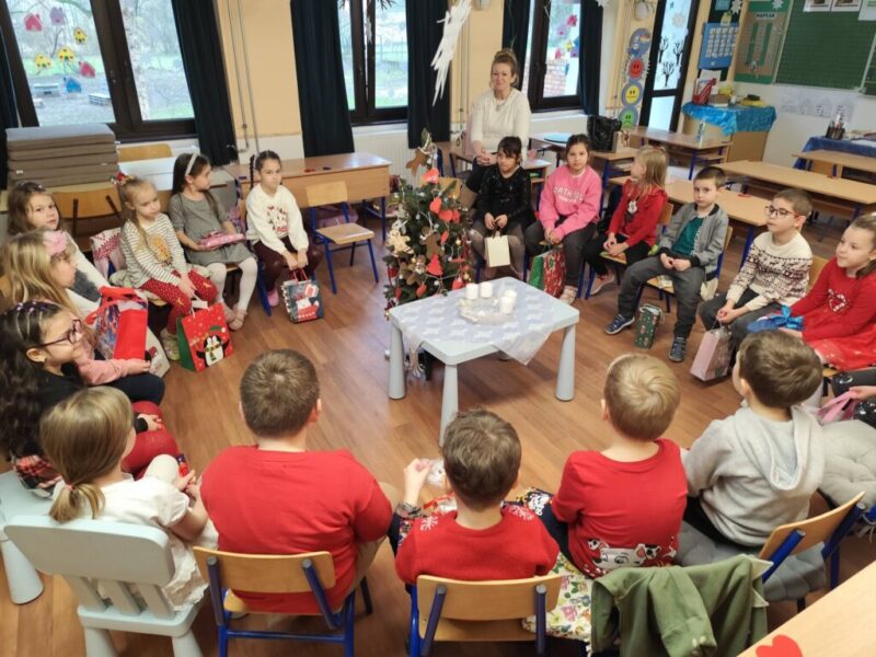 A téli szünet előtti utolsó napon, mindenki hozott is valami kis apróságot, amivel megajándékozhatta a társát. Mielőtt átadtuk volna az ajándékokat, körbe ültünk és mindenki elmondta milyen jó cselekedeteket csinált az általa húzott gyermeknek. (Voltak, akik másokkal is kedveskedtek.) Ezt követően pozitív tulajdonságokat mondott a szóban forgó tanulóról és végül felfedte azt is, hogy kiről van szó. A gyerekek nagyon ügyesen titokban tartották, kreatívak voltak és nagyon élvezték a „feladatot”. Ebből hagyomány lesz. 🙂