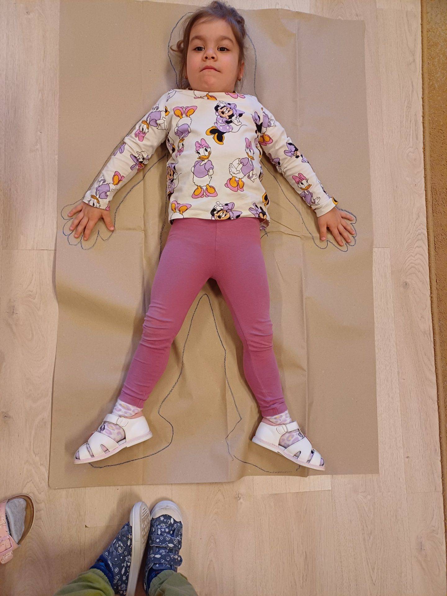 Ezt követően elmeséltem az Újra együtt! c. mesét, ami egy nagyon aranyos, egyszerű történet, és felvezette az érzékszerveinkről szóló témát, amihez a legkisebb kislányt körberajzoltuk egy csomagolópapíron. Ezt követően együtt megrajzolták a hiányzó részeket (szem, orr, száj, haj stb.) Az érzékszervekhez a munkafüzet 51-53.oldalán levő képek segítségével kiválasztottunk és lerajzoltunk egyet-egyet a neki megfelelő érzékszerv mellett. Egyfajta ismétlésnek is megfelelő volt a korábbi óvodai testrészünk tematika felidézéséhez.