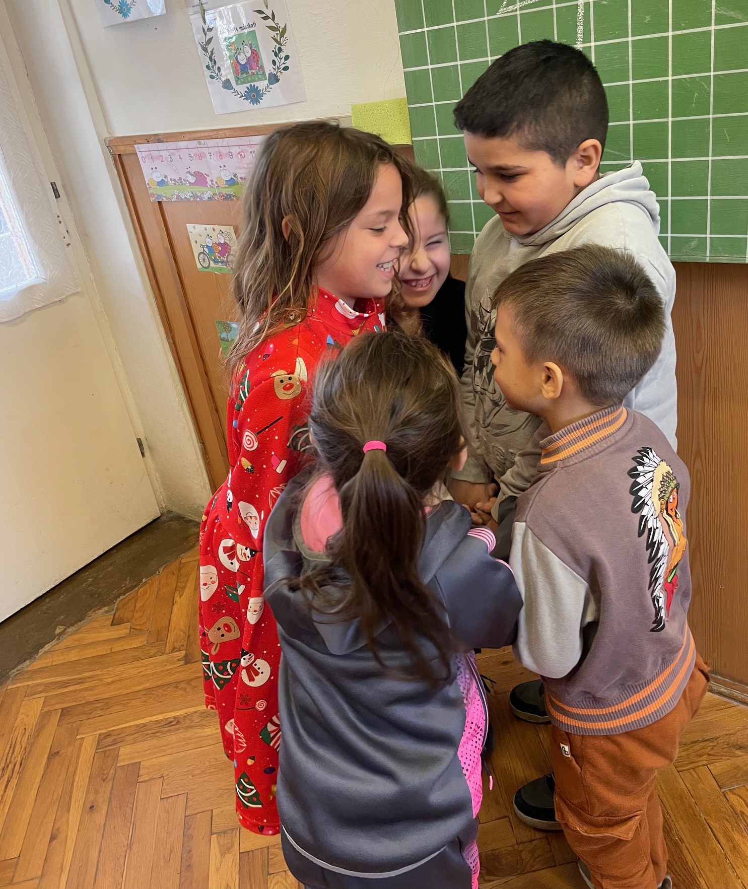 A decemberi Boldogságóra program alkalmával „Boldogító jó cselekedetek” volt a témánk. A foglalkozást egy kis játékkal kezdtük: a tanulók egy kört alkottak, majd különböző állításokat mondtam nekik, amikről el kellett dönteniük, hogy a „jó”, vagy a „rossz” tettek táborát erősíti-e. Ha az előbbit, akkor szorosra kellett fogniuk a kört, ha utóbbit, akkor pedig minél távolabb kellett egymástól állni, tehát széles kört kellett alkotni. Az óra második felében pedig azt kértem, hogy rajzlapra rajzolják le, mi az, amivel otthon anyának/apának/nevelőnek stb. segítségére tudnak lenni most a karácsony alkalmával, de általánosságban is.
