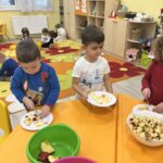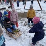 Bátor célokat fogalmaztak meg az egészség terén is: meglátogattuk a doktor nénit, hősiesen kóstolták a gyógyteákat, barátkoztak a zöldségek – gyümölcsök ízeivel, sőt, a gyümölcssalátához maguk daraboltak késsel. A lehullott hó pedig egy igazi közösségi célt is hozott: megtanulni egymást húzni a szánkón.