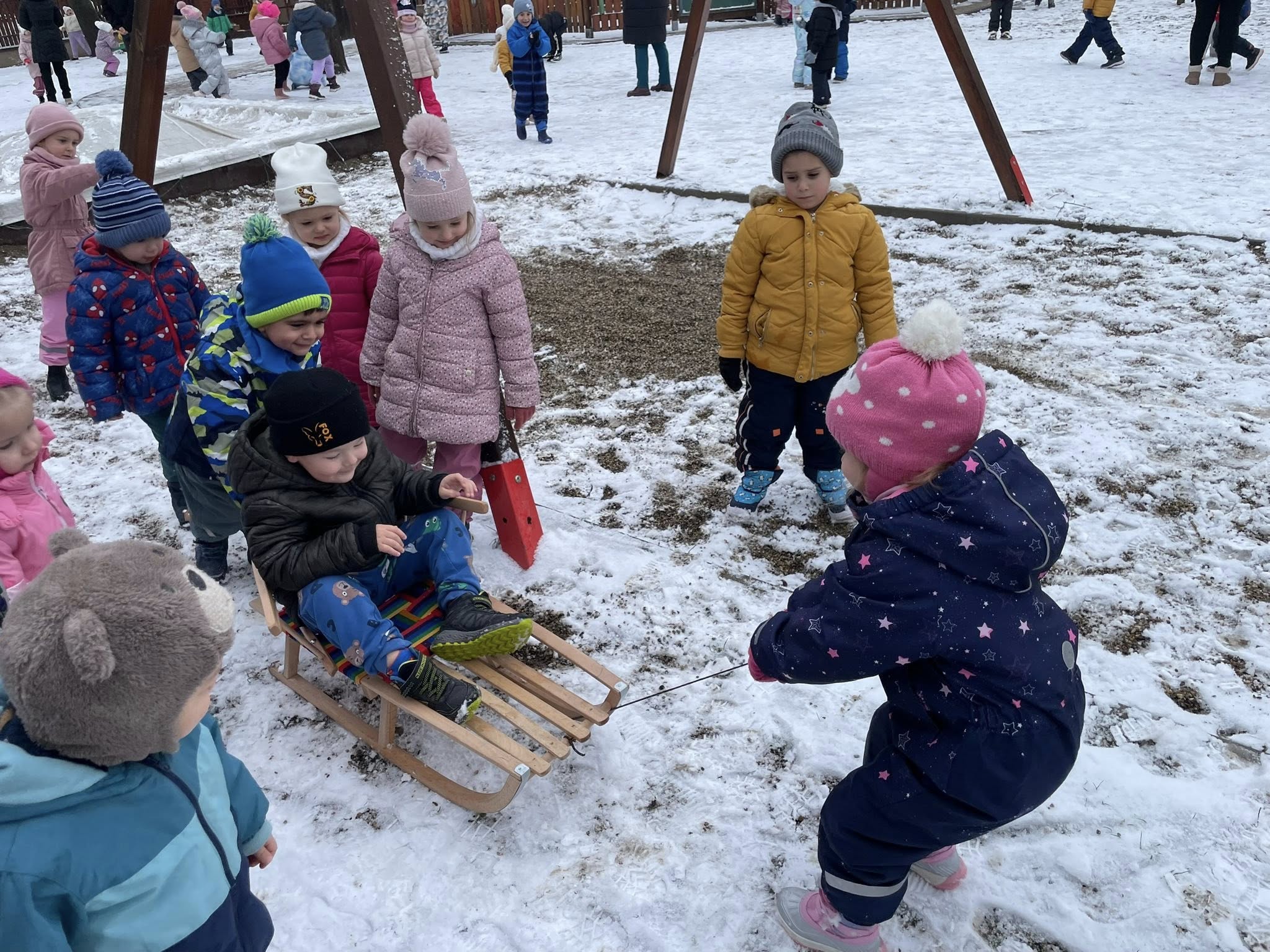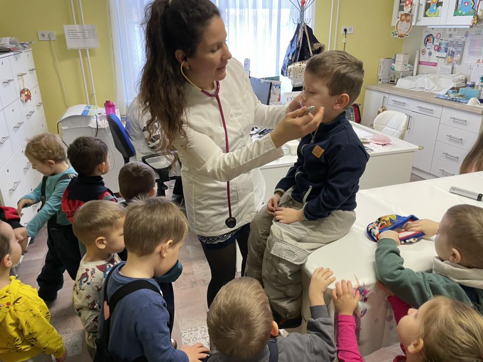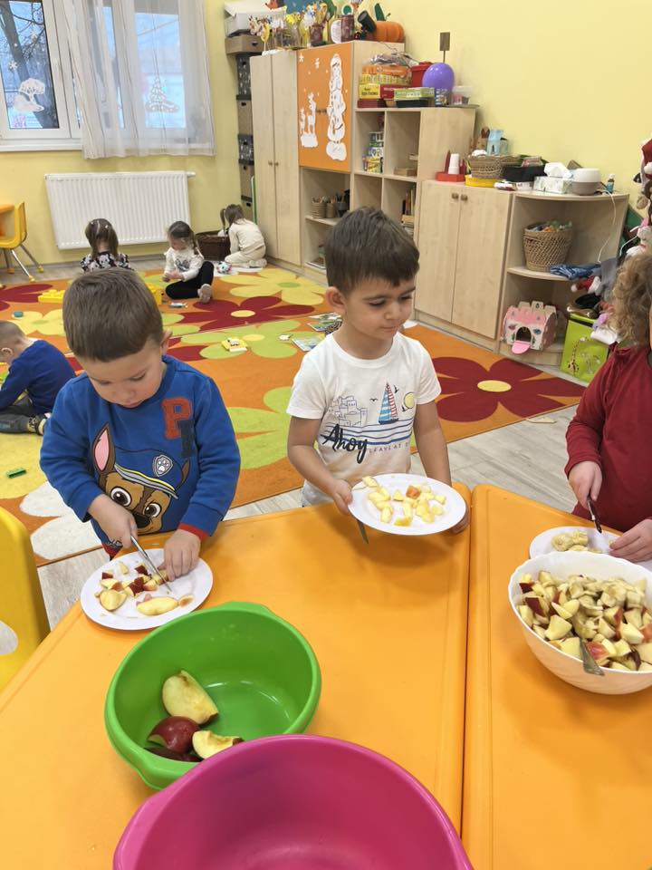 Bátor célokat fogalmaztak meg az egészség terén is: meglátogattuk a doktor nénit, hősiesen kóstolták a gyógyteákat, barátkoztak a zöldségek – gyümölcsök ízeivel, sőt, a gyümölcssalátához maguk daraboltak késsel. A lehullott hó pedig egy igazi közösségi célt is hozott: megtanulni egymást húzni a szánkón.