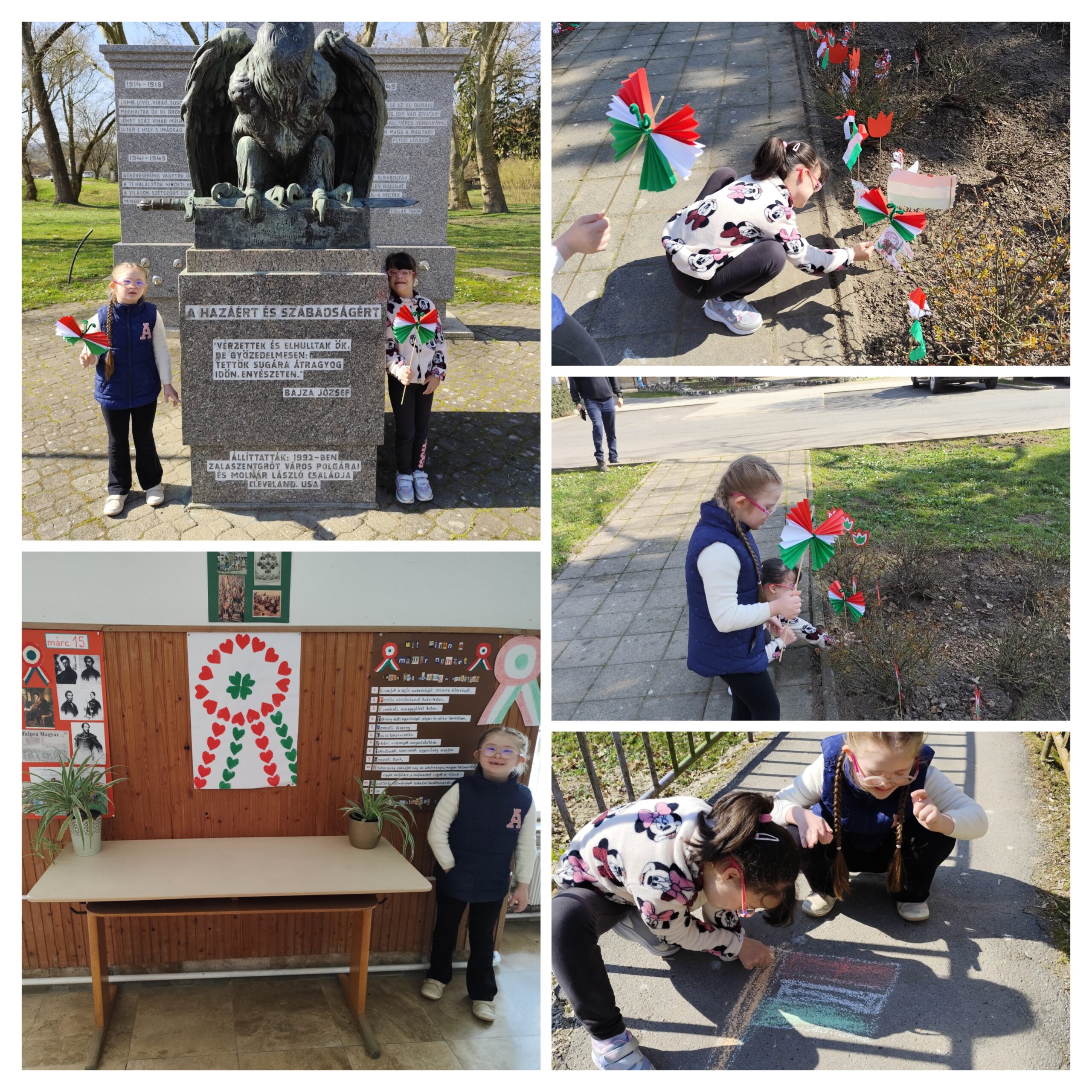 • Megemlékeztünk a hőseinkről az emlékmű előtt, melyre díszes nemzeti lobogót készítettünk. Mekkora öröm nekünk, hogy mi már szabadságban élhetünk, oda mehetünk ahova akarunk.