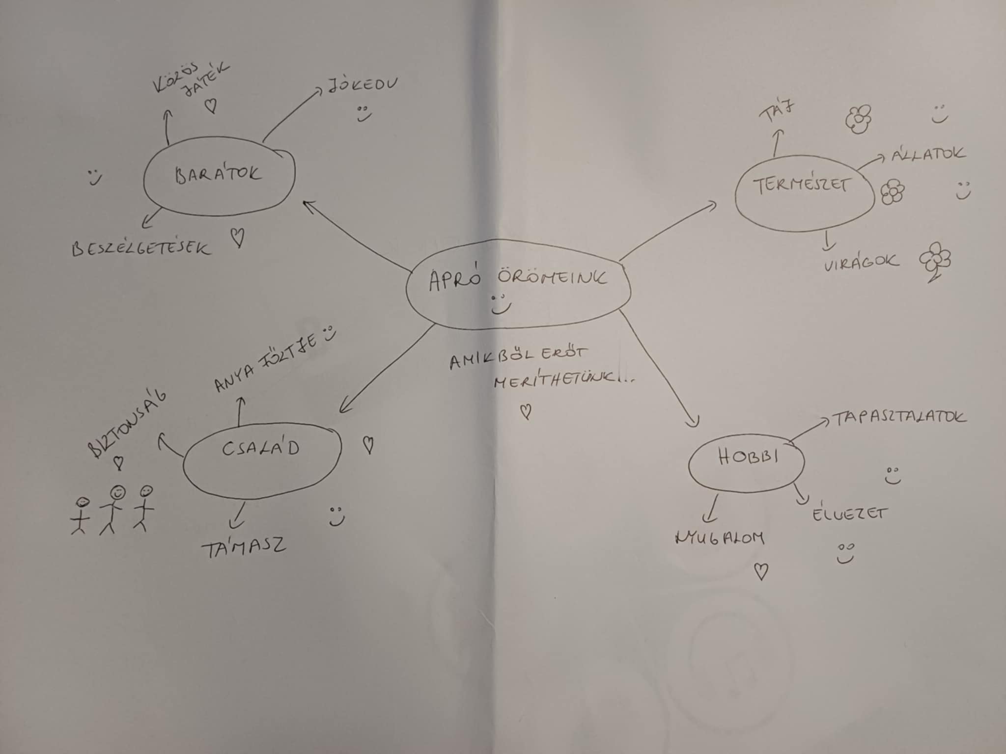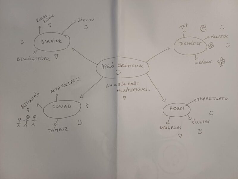 Ezután megkértem a csoportokat arra, hogy válasszanak 3-3 dolgot, melyet apró örömként a család, a természet, a barátok és a hobbi nyújthat számukra. A családdal foglalkozó csapat kiemelte a támasz, biztonság és anya főztje gondolatokat. A hobbival foglalkozók a tapasztalatokat, az élvezetet és a nyugalmat emelte ki. A természettel foglalkozók a virágokat, állatokat és a tájat, míg a barátokkal foglalkozók a közös játékot, a beszélgetéseket és a jókedvet említették. Ebből elkészítettünk egy gondolattérképet is.