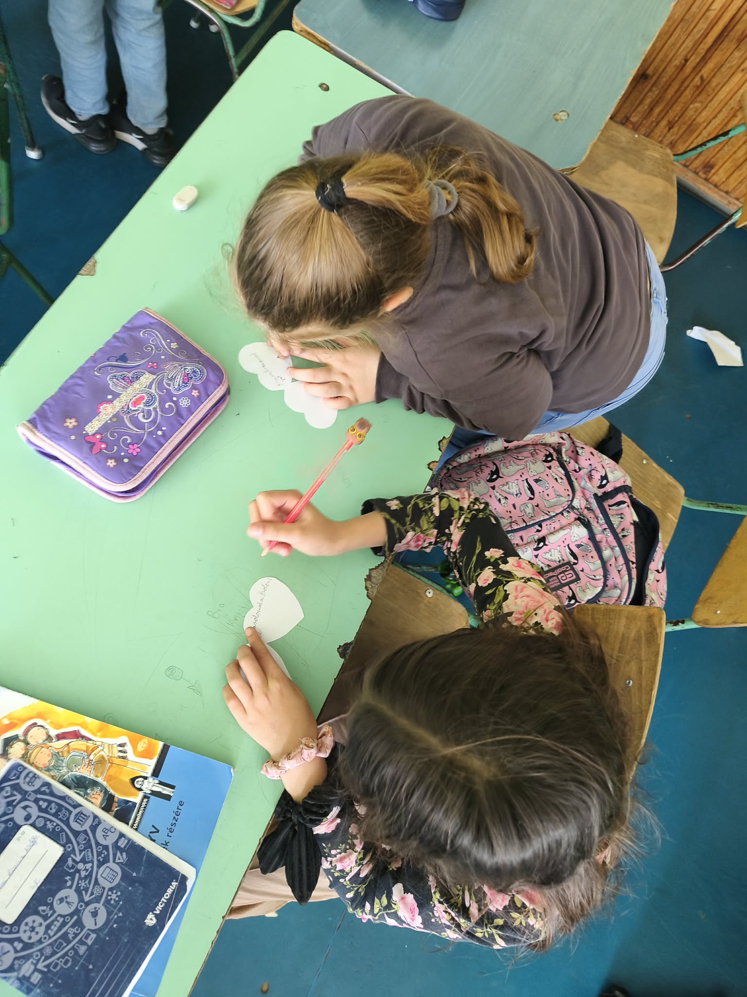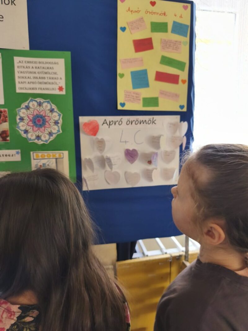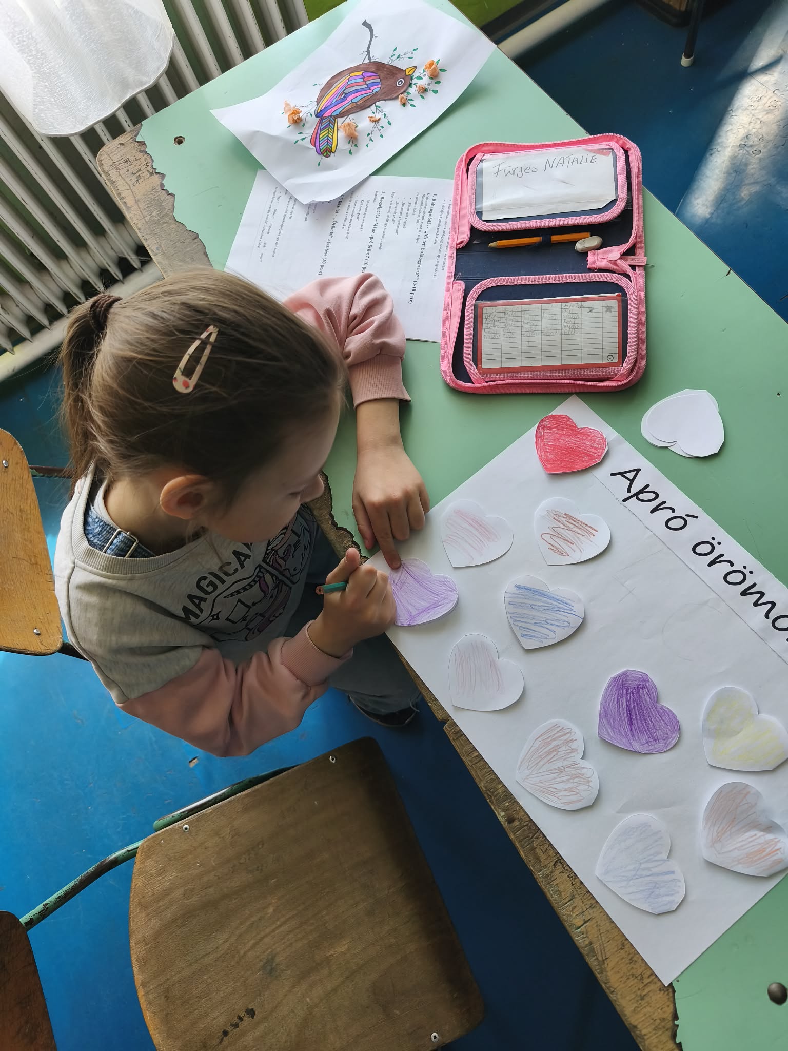 Ezen az órán a gyerekekkel az élet apró, mégis fontos örömeire figyeltünk. Mindannyian szívecskékbe írtuk le azokat a pillanatokat, amelyek mosolyt csalnak az arcunkra a mindennapokban. A sok kis szív együtt egy nagy közös alkotássá vált, amely megmutatja, mennyi szépség és boldogság vesz körül minket nap mint nap.