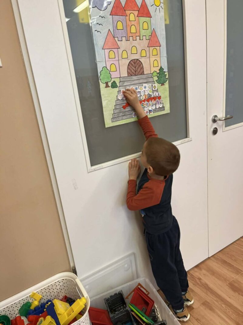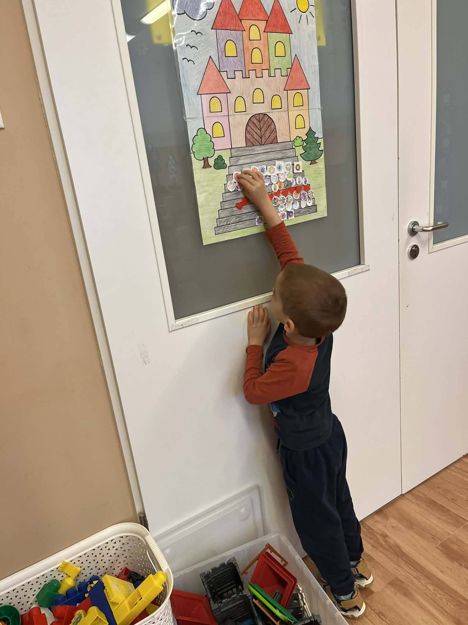 5. Téma lezárása: Apró örömök jelének kiszínezése majd felragasztása a Boldogság vár 7. lépcsőfokára