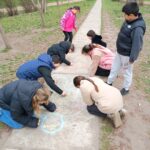 A szabadban, a friss levegőn krétával a járdán körberajzoltunk egy kislányt és egy kisfiút a csoportból, majd megbeszéltük, hogy mit szeretünk saját magunkban. Végül leírtuk az adott testrészekhez kötve a felsorolt külső és belső tulajdonságokat. Éneklés, kézműveskedés, lovaglás, kedvesség, foci…