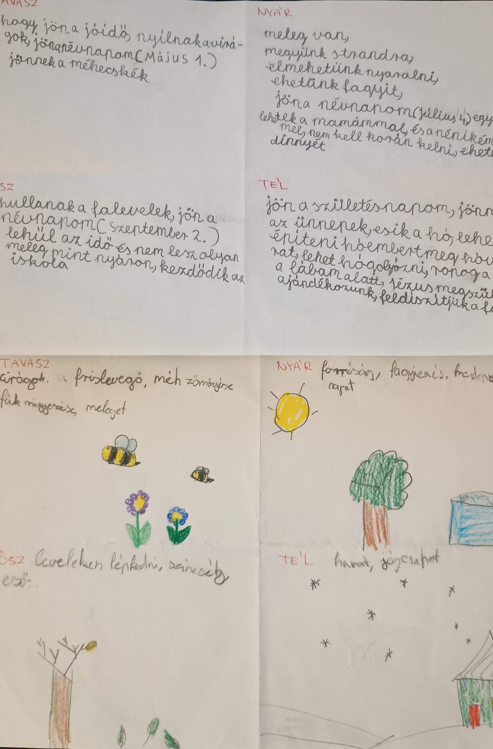 Készítettünk összefoglalót egy év örömforrásairól. Leírtuk és lerajzoltuk, hogy a 4 évszakban mi okoz nekünk örömet: