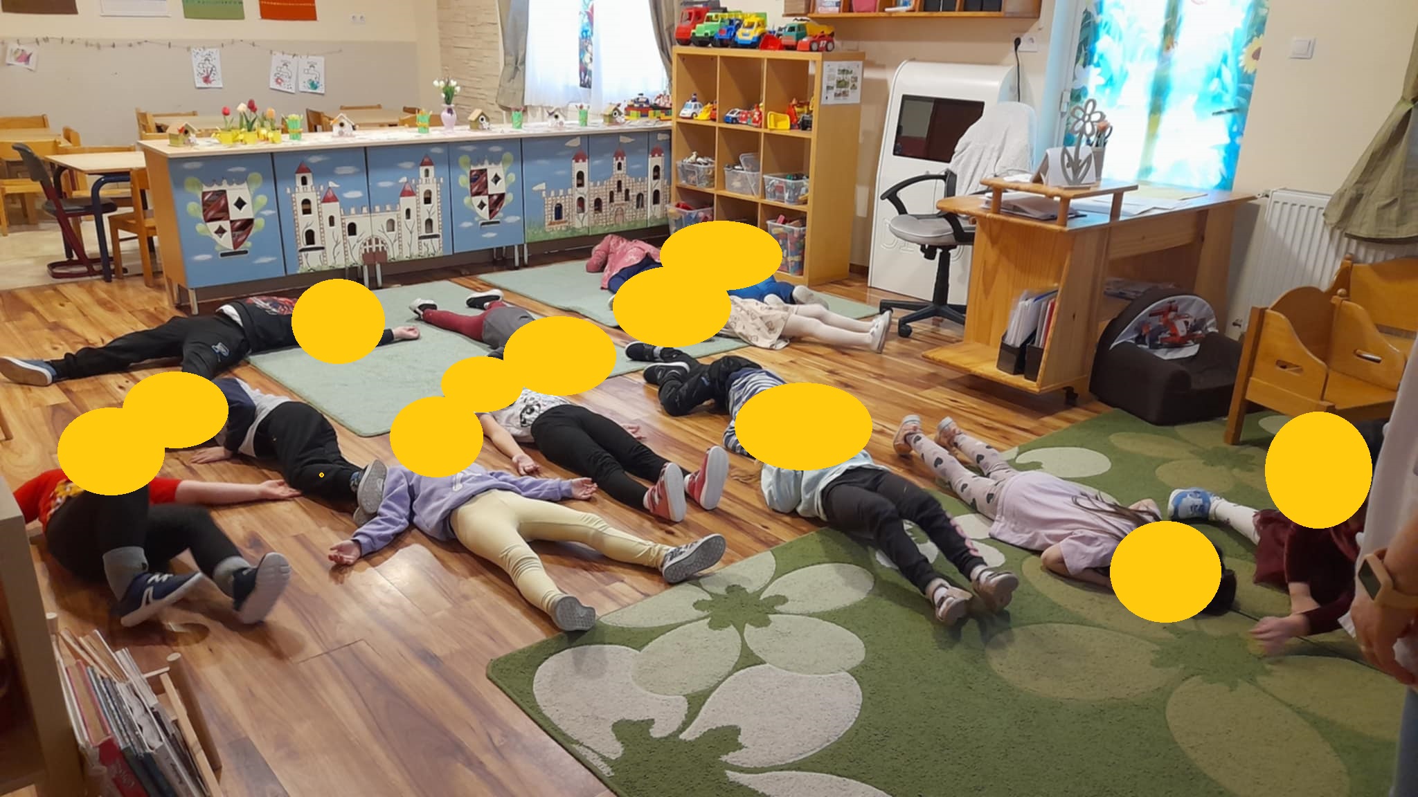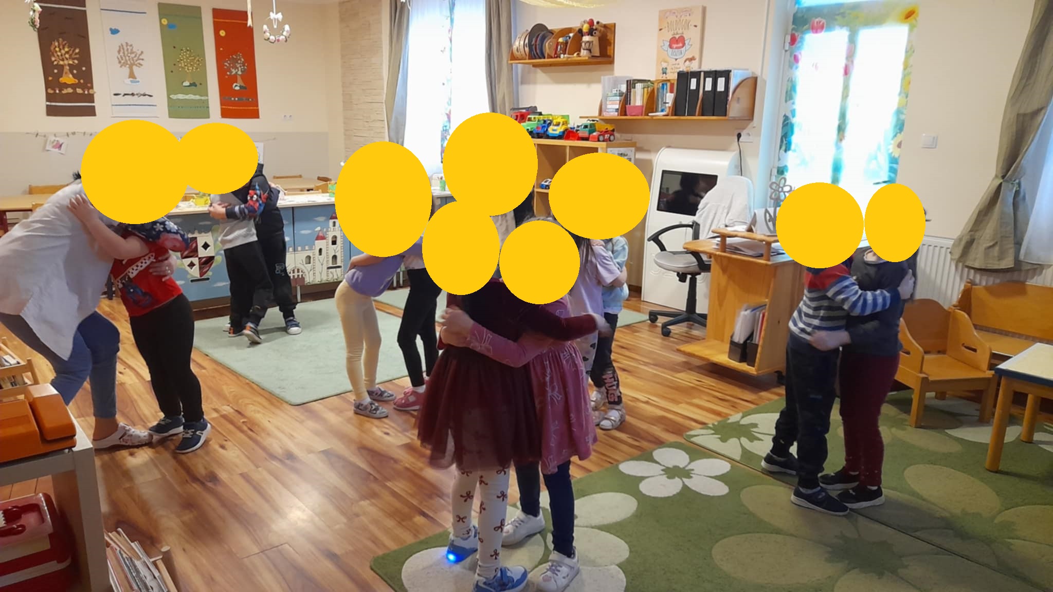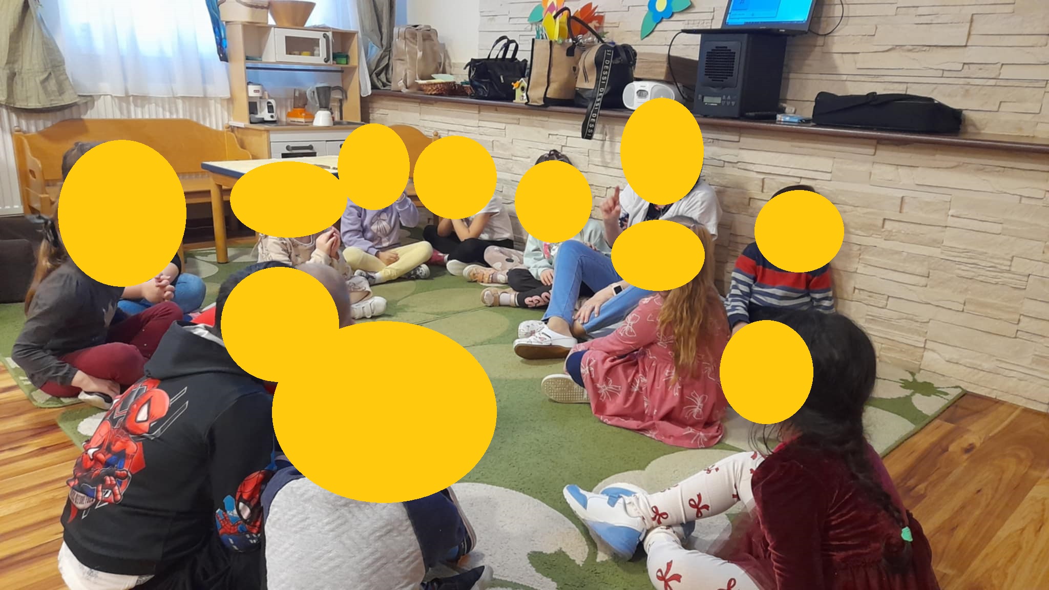 A mesehallgatás során csendben figyeltek, és érdeklődéssel hallgatták Bezzeg Andrea „Újra együtt” című történetét. A beszélgető körben képesek voltak megfogalmazni saját örömeiket, és aktívan kapcsolódtak egymás élményeihez. A hívóképek használata segítette a fogalmak konkrétabb megértését és az érzékszervi tapasztalatok összekapcsolását.
