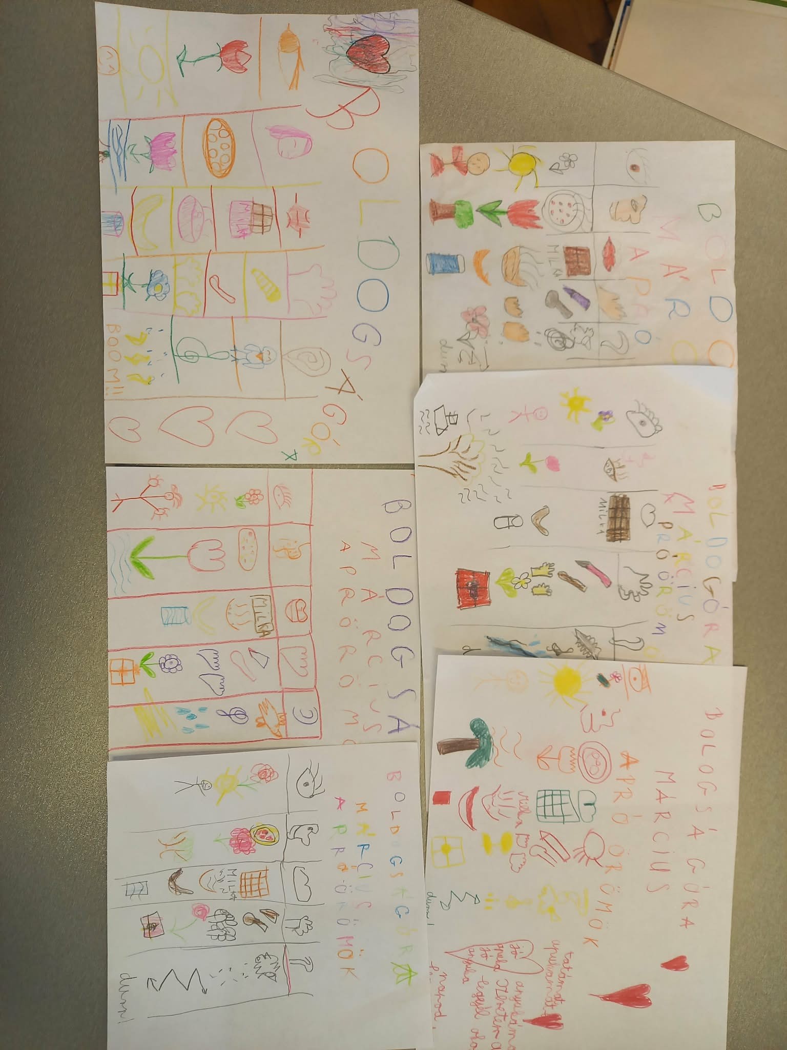 Milyen apró örömöket érezhetünk az öt érzékszervünkkel? Ezeket rajzoltuk le. Közben megismertük a különböző érzékszerveinket és rácsodálkoztunk , hogy mennyi örömforrásnak a lehetősége. Szituációs játékok segítségével eljátszottuk az érzékszerveink által nyújtott örömforrásokat.
