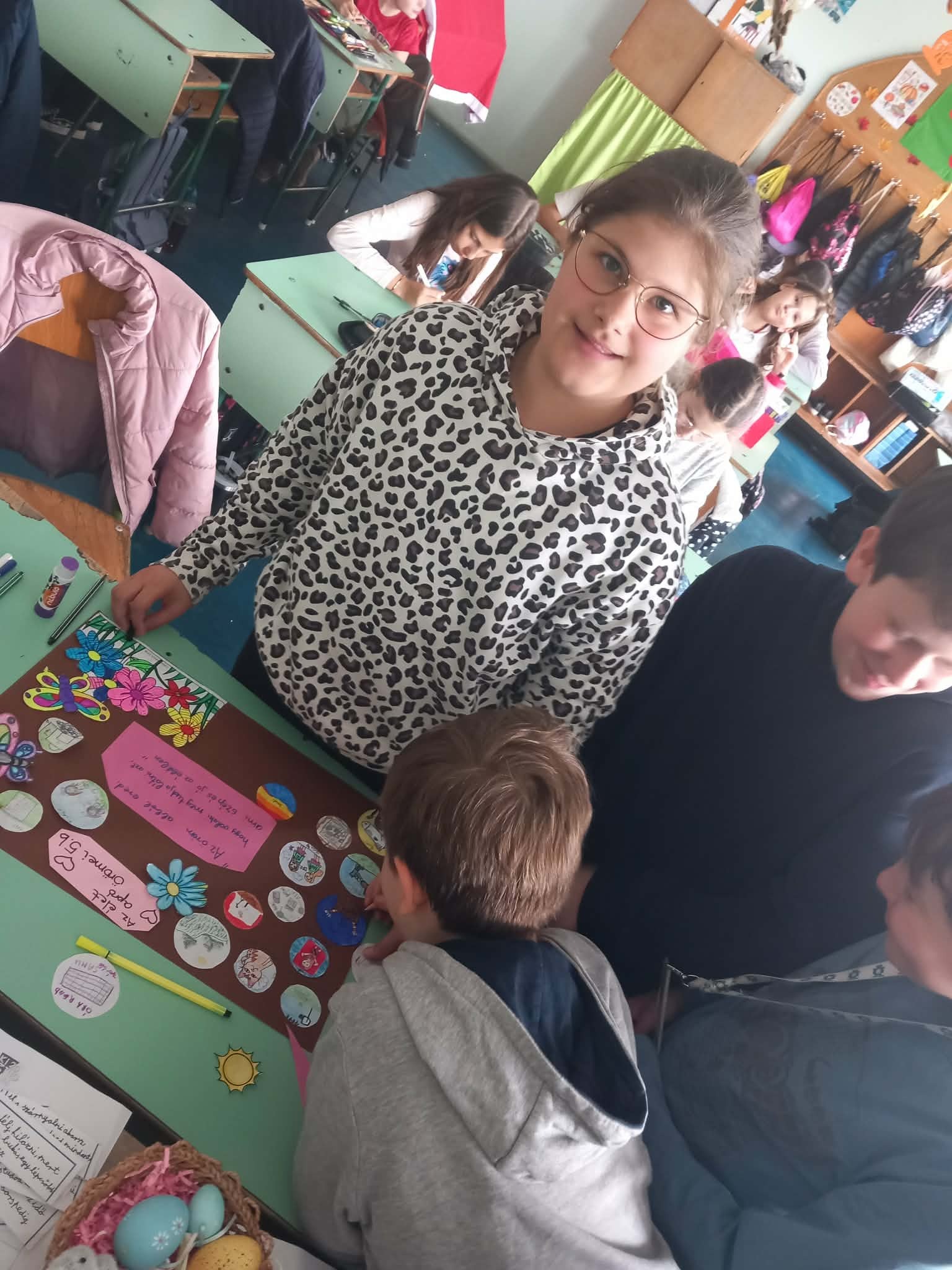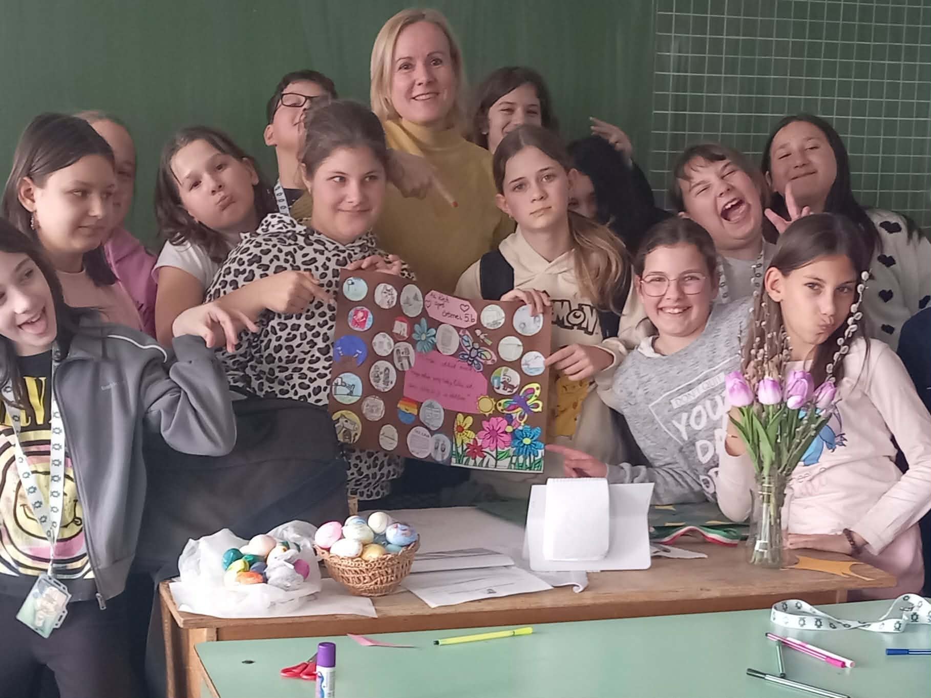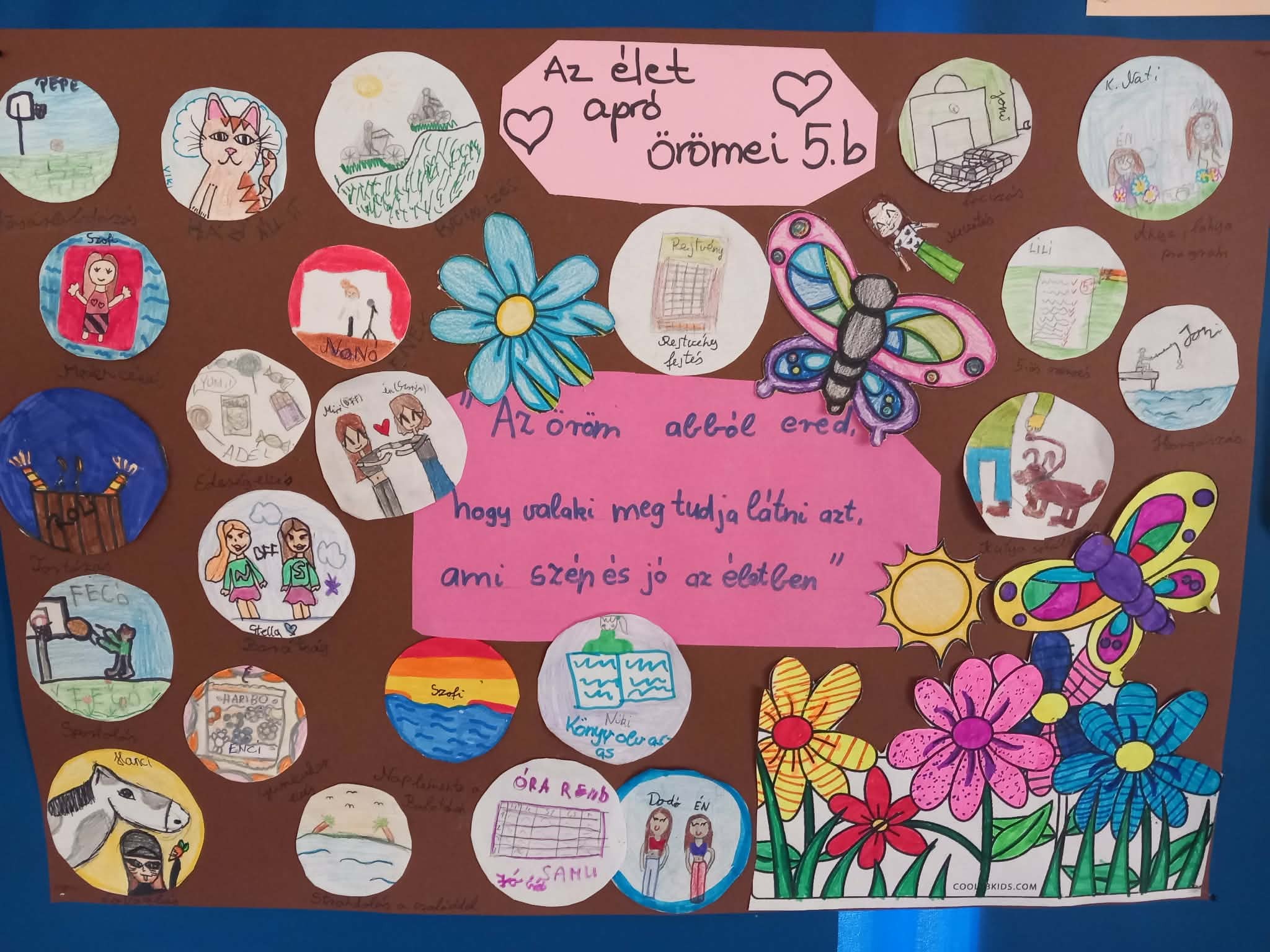 Osztályommal az élet apró örömeiről beszélgettünk. Sok jó példát elmeséltek, kinek mi okoz kis örömöt a mindennapjai során. A példák közt szerepelt a pihenés, sportolás, háziállatokkal való törődés, barátokkal való programok, szabadidős programok, jobb érdemjegyek elérése, családdal való együttlét. Végül zárásként mindenki lerajzolta milyen apró örömök segítik őket a mindennapjaikban. Projektmunkánkat kiállítottuk iskolánk aulájában.