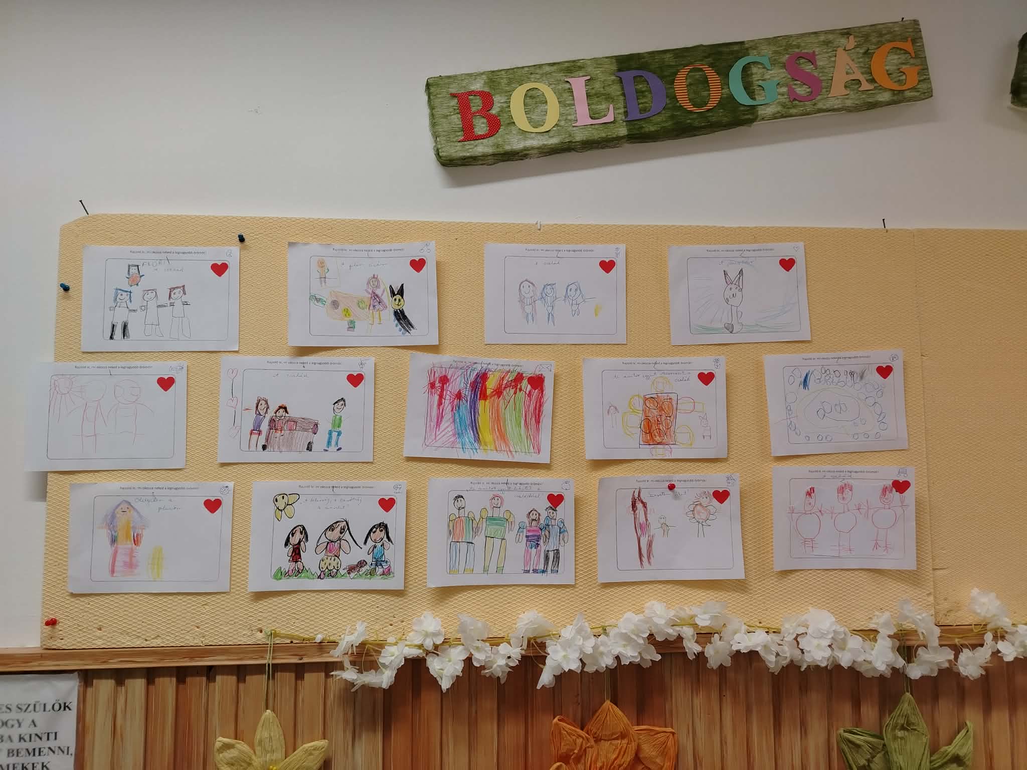 A tevékenységet beszélgetőkörrel kezdték. Majd megbeszélték közösen, hogy kit mi tesz boldoggá. A tevékenység célja az öröm felismerése. Mindenki kapott egy szív formát, amiben lerajzolhatták, aminek a legjobban örülnek.