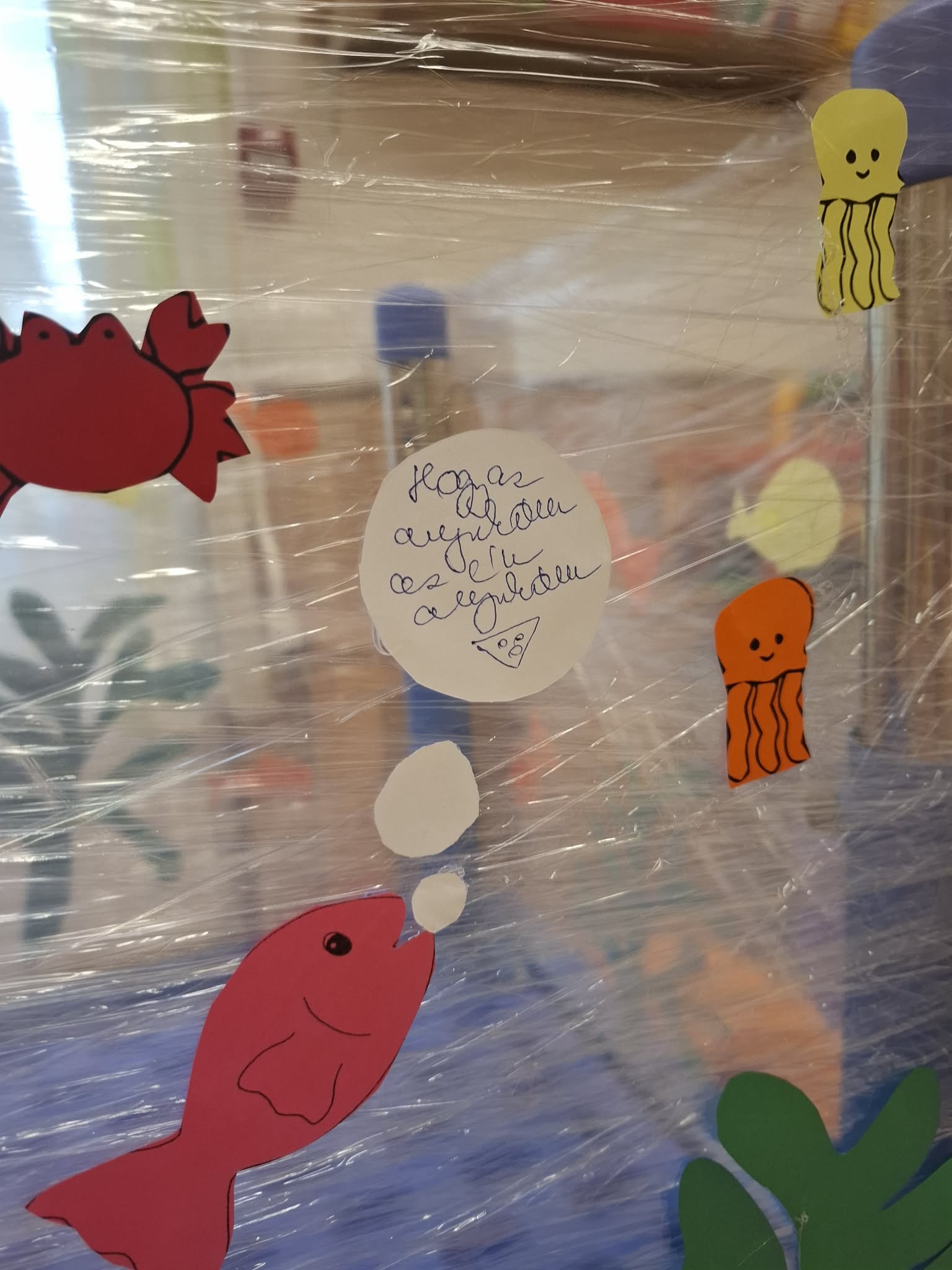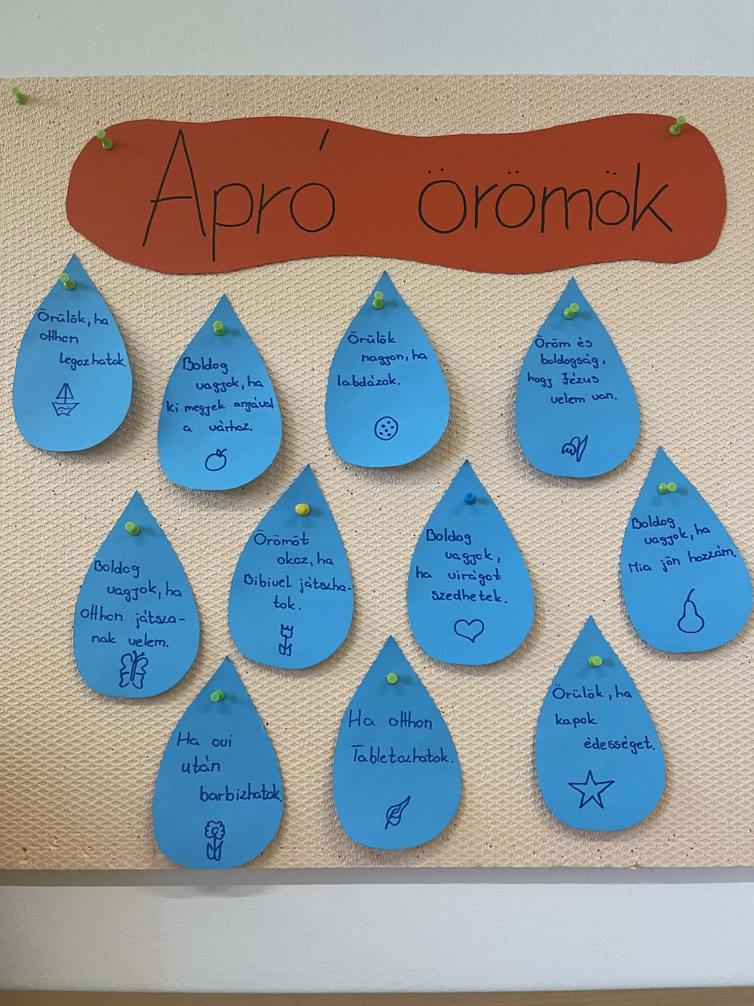 A csoport közösen készített egy nagy akváriumot, benne sok-sok hallal és miden mással, a gyerekek elmondták óvó néninek az örömüket, majd a kis gondolataik bekerültek az akváriumba. A téma lezárásaként „Mi volt ma a legjobb” -kört játszottak, elmondhatták a gyerekek, hogy miért voltak a leghálásabbak.