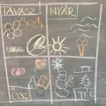 Az óra kezdetén meghallgattuk a hónap dalát, majd rajzos formában összefoglaltuk az év örömformáit évszakokra bontva.