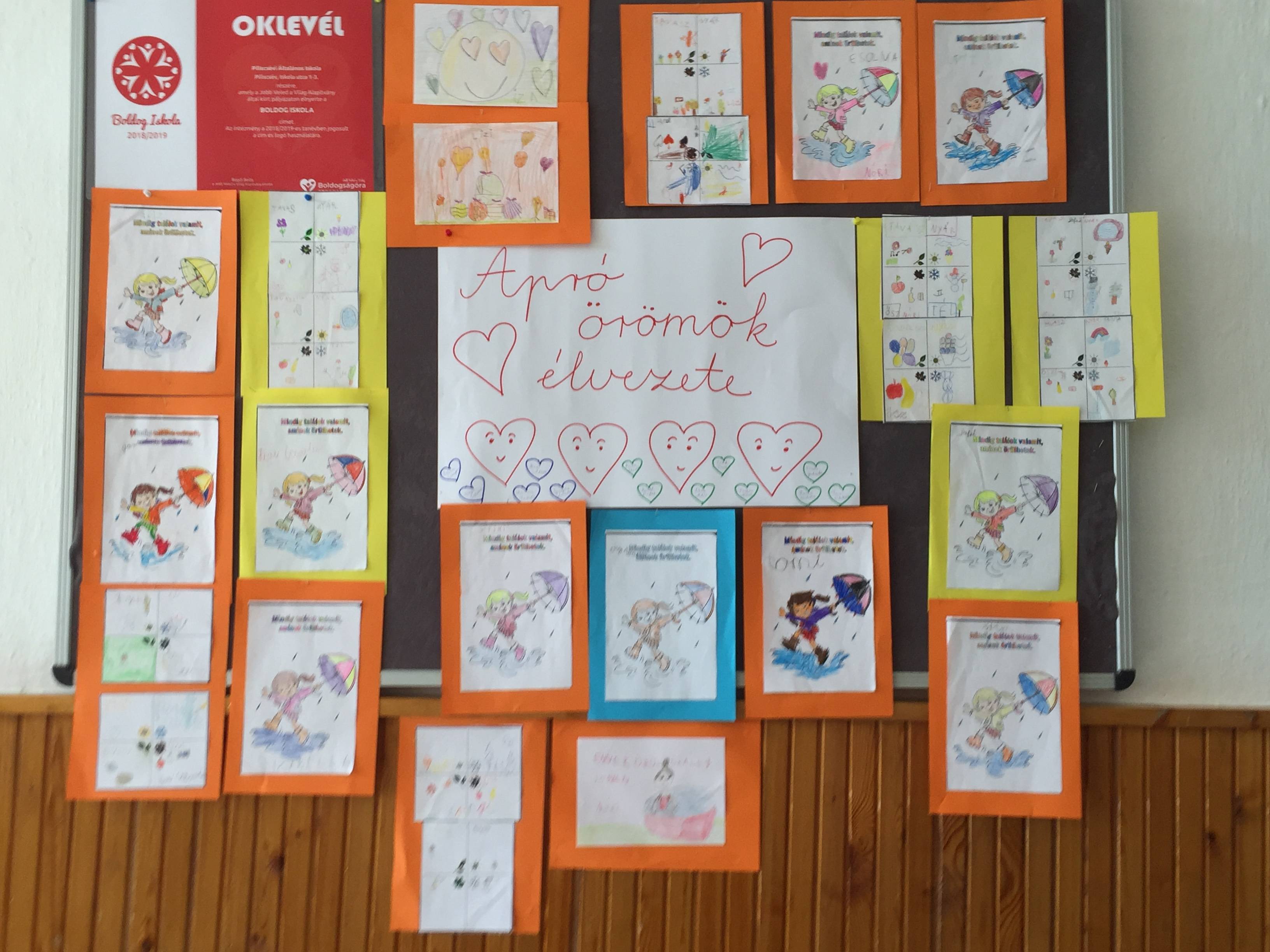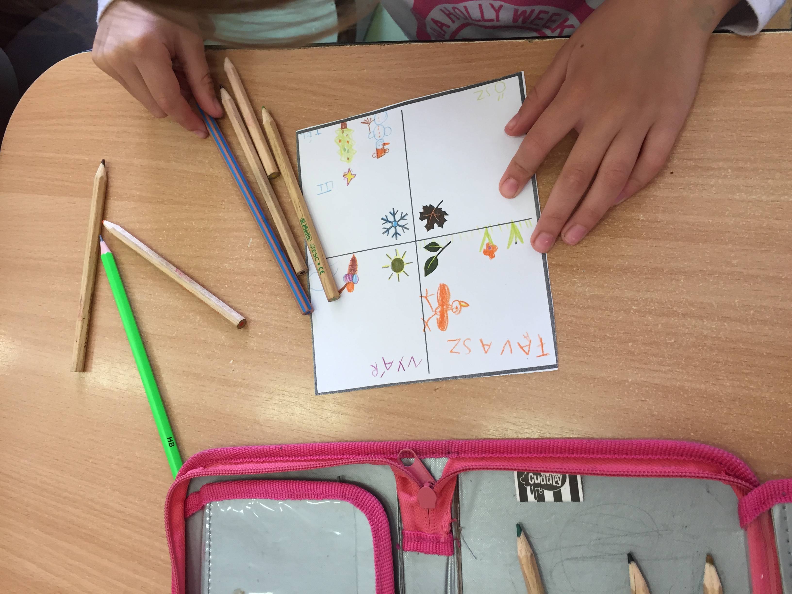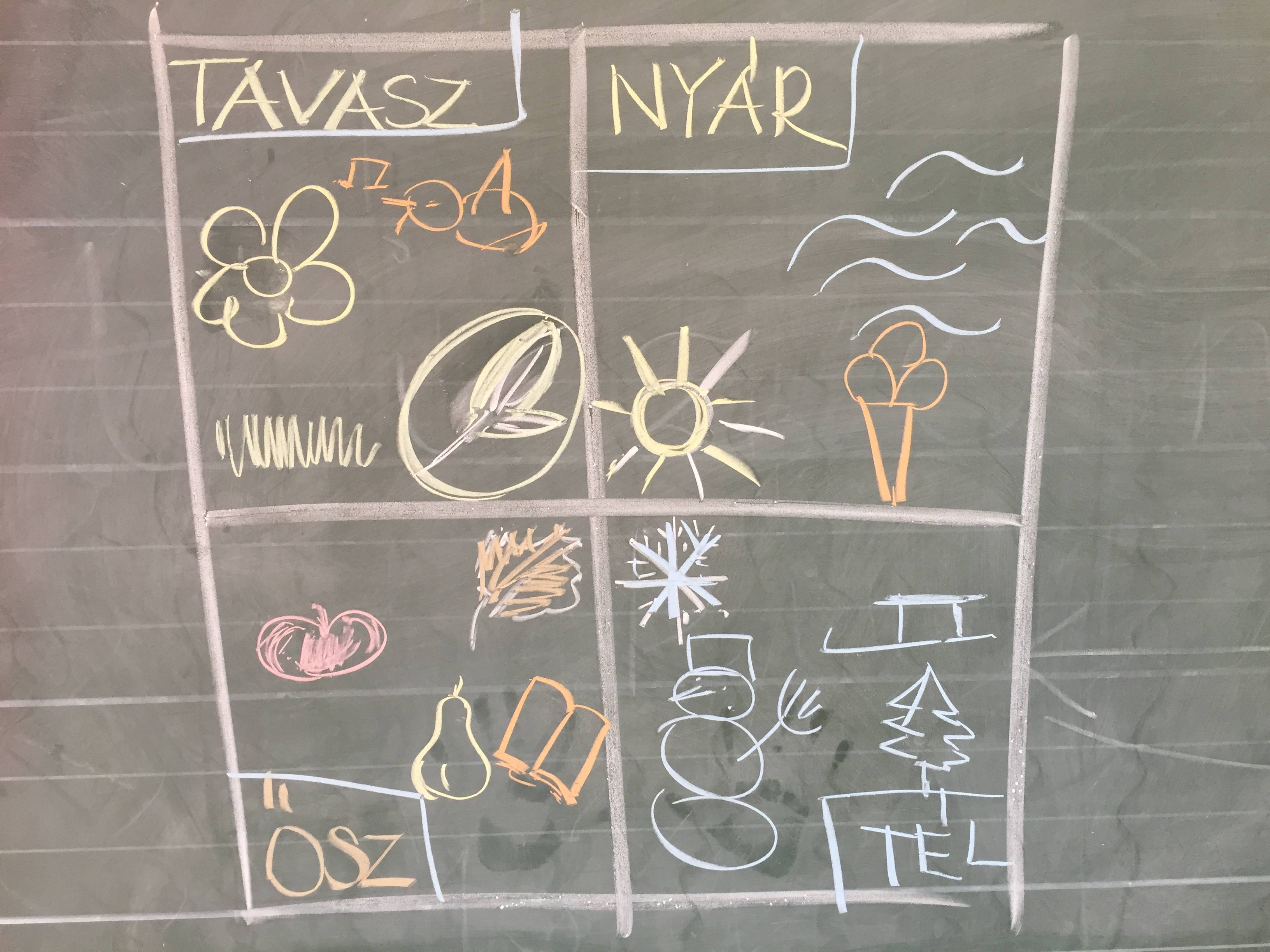 Az óra kezdetén meghallgattuk a hónap dalát, majd rajzos formában összefoglaltuk az év örömformáit évszakokra bontva.