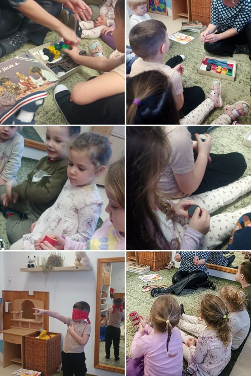 A tapintás öröme: A tapintós játék ( bársony, bőr, csiszoló papír,műszőrme…) során egyértelműen különböző textúrákkal ismerkedhettek a gyerekek, melyek hozzájárultak a környezetünkről alkotott kép megismeréséhez, az idegrendszer fejlődéséhez, az ujjak érzékenységének növeléséhez.