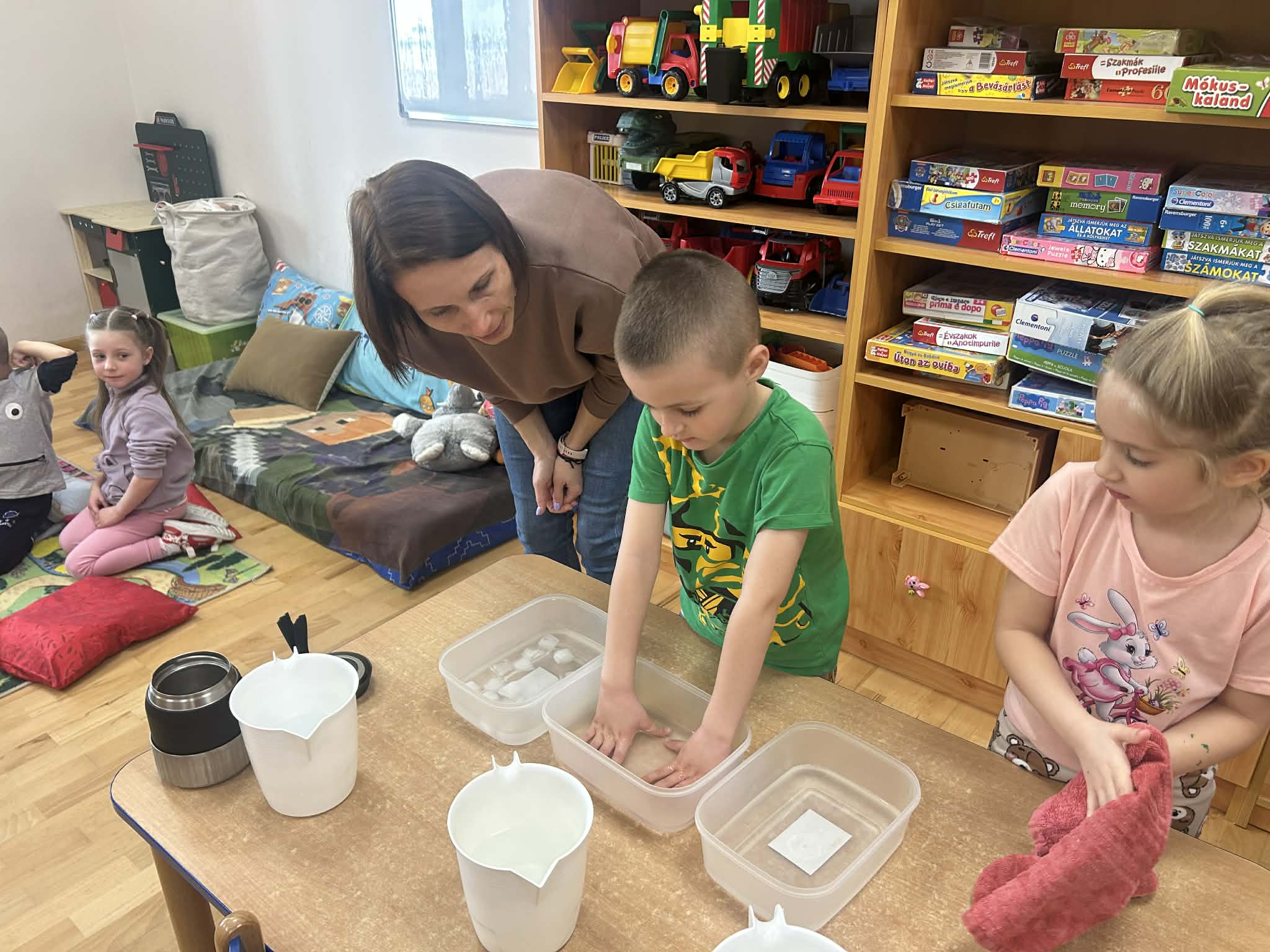 A hét során sokféle tevékenységet végeztünk. Megtanultuk a Boldog mondókát és a Boldogság verset, amelyek játékos formában segítették a pozitív érzelmek kifejezését. A gyerekek előre megrajzolt esőcsepp formákat vágtak ki, melybe lerajzolták, hogy mitől érzik magukat boldognak, ezek lettek a „boldogság cseppek”. A víz világnapjához kapcsolódva különböző kísérleteket végeztünk vízzel, amelyek során a gyerekek tapasztalatokon keresztül ismerkedhettek meg a víz tulajdonságaival. Emellett sokat mozogtunk, és az időjárásnak köszönhetően sok időt tölthettünk az udvaron, ami mindig nagy öröm számukra .