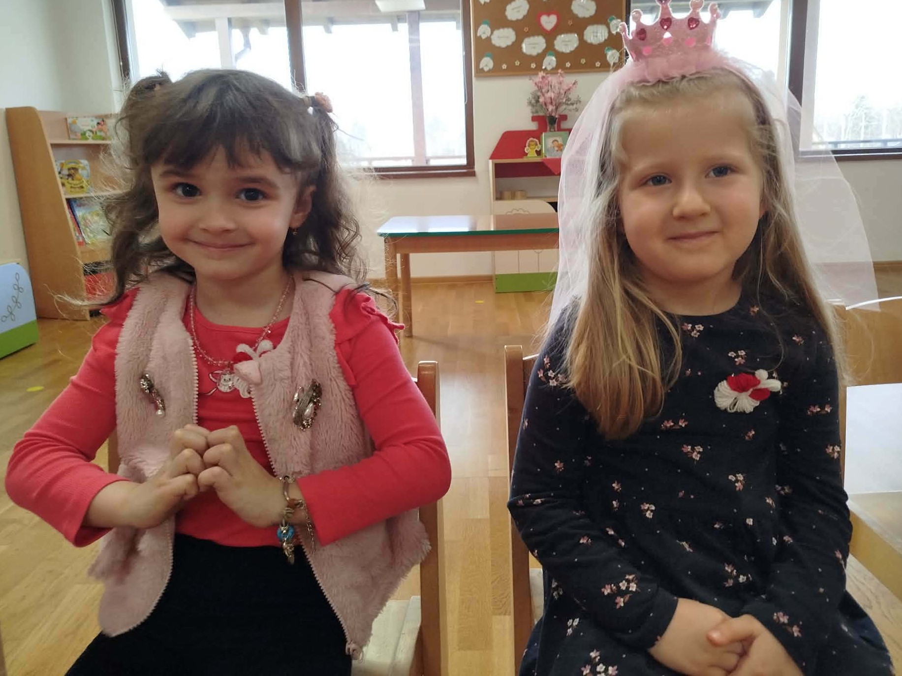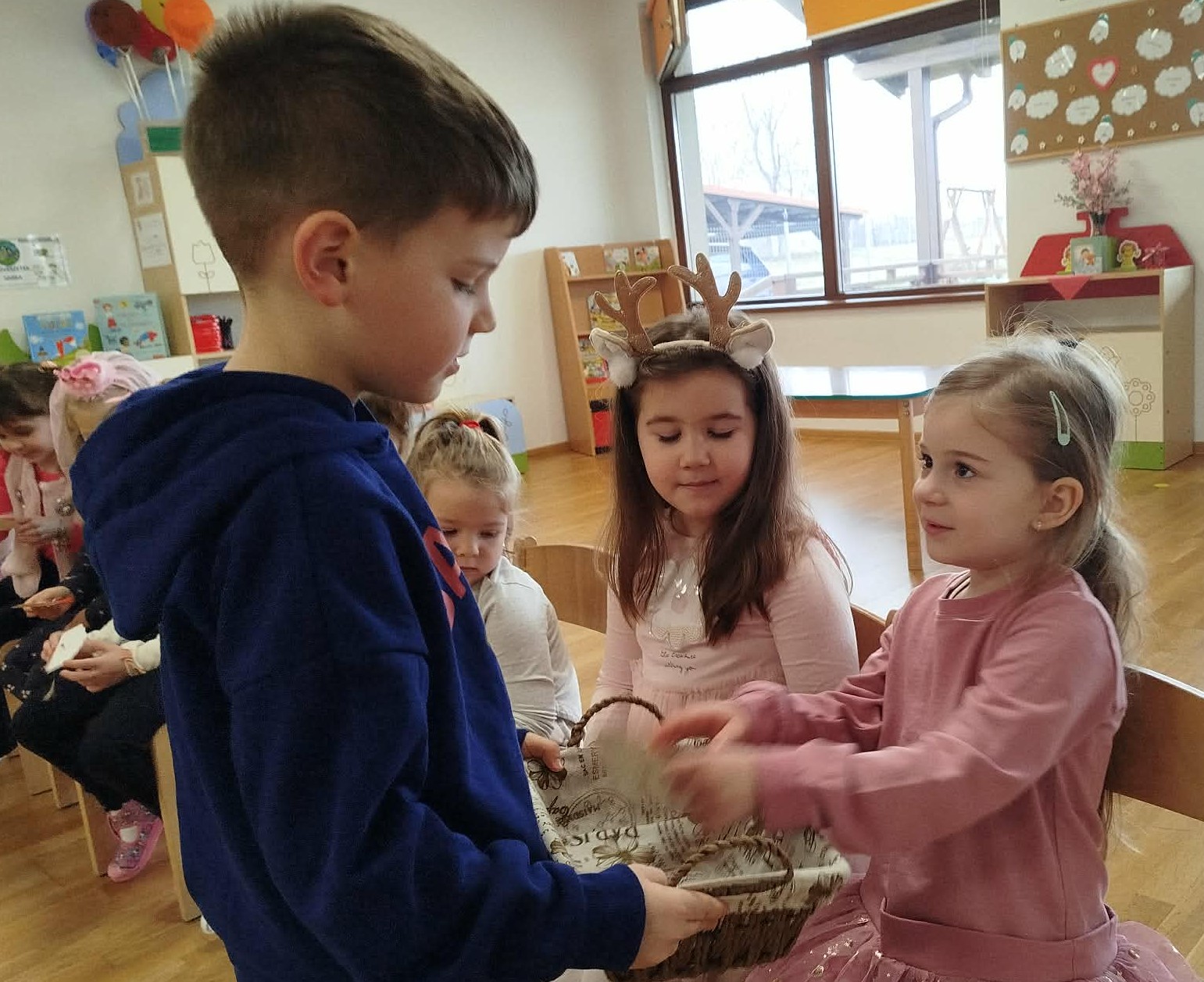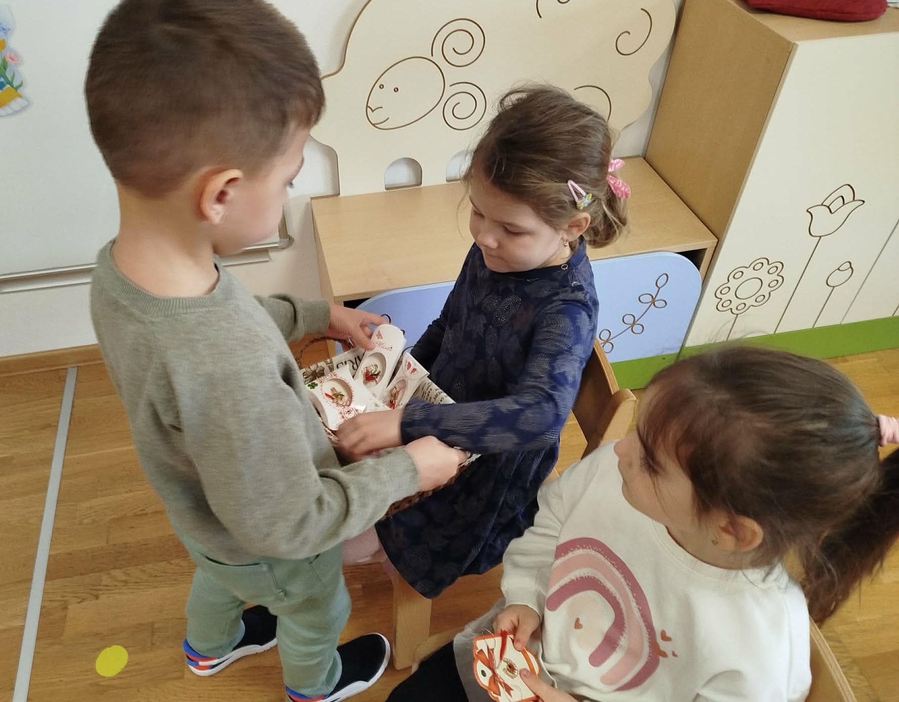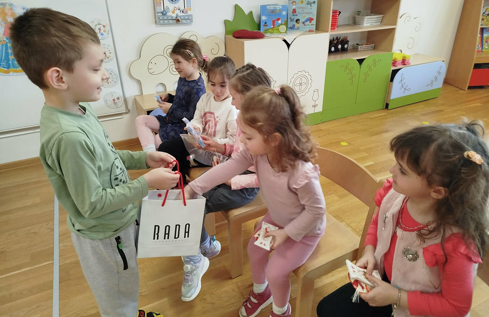 A tevékenységet a mondóka elsajátításával kezdtük, majd a fiúk köszöntötték a lányokat egy kedves kitűzővel, amit a kislányok nagy örömmel fogadtak.