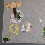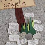 Még az online oktatás megkezdése előtt elindítottuk a márciusi játékunkat a következő történettel: az iskola folyosólyán keletkezett egy sziget. A sziget nagyon kopár, építsük fel együtt! Kartonból kivágott kavicsokat osztottunk, amire mindenki felírhatott bármit, ami abban a pillanatban örömteli érzéssel töltötte el. El is neveztük a szigetet Apró örömök szigetének. Elkezdődött az építkezés. Aztán az iskola bezárásával kicsit megtorpant. Mindenki azt gondolta, ebben a helyzetben nincs semmi jó. Írtam egy felhívást a közös csoportunkba, hogy ha elküldik az örömteli élményeiket, én kinyomtatom, és beviszem az iskolába, építem tovább a szigetet. Lassan elkezdtek érkezni az örömökről szóló üzenetek még felnőtt kollégáktól is. Volt köztük egy különleges is, ami miatt úgy döntöttem, a sziget tovább épül, ameddig szükség lesz rá. Az üzenet így szólt: „Köszönöm, hogy gondozod a boldogságunkat!”