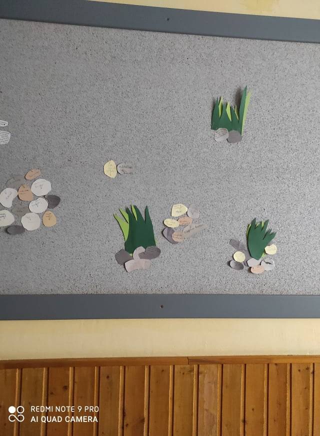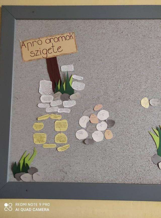 Még az online oktatás megkezdése előtt elindítottuk a márciusi játékunkat a következő történettel: az iskola folyosólyán keletkezett egy sziget. A sziget nagyon kopár, építsük fel együtt! Kartonból kivágott kavicsokat osztottunk, amire mindenki felírhatott bármit, ami abban a pillanatban örömteli érzéssel töltötte el. El is neveztük a szigetet Apró örömök szigetének. Elkezdődött az építkezés. Aztán az iskola bezárásával kicsit megtorpant. Mindenki azt gondolta, ebben a helyzetben nincs semmi jó. Írtam egy felhívást a közös csoportunkba, hogy ha elküldik az örömteli élményeiket, én kinyomtatom, és beviszem az iskolába, építem tovább a szigetet. Lassan elkezdtek érkezni az örömökről szóló üzenetek még felnőtt kollégáktól is. Volt köztük egy különleges is, ami miatt úgy döntöttem, a sziget tovább épül, ameddig szükség lesz rá. Az üzenet így szólt: „Köszönöm, hogy gondozod a boldogságunkat!”