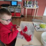Megismerkedtünk a gyapjúval, labdát „söndörgettünk” belőle. A gyerekek meglepődve és csodálattal kísérték végig a fonal keletkezését a bárány nyírásától a kézbe vett pihe-puha gyapjúig. „Jó érzés simogatni a kezemmel” mondták. Aprók között hatalmas öröm volt ezt megtapasztalni!
