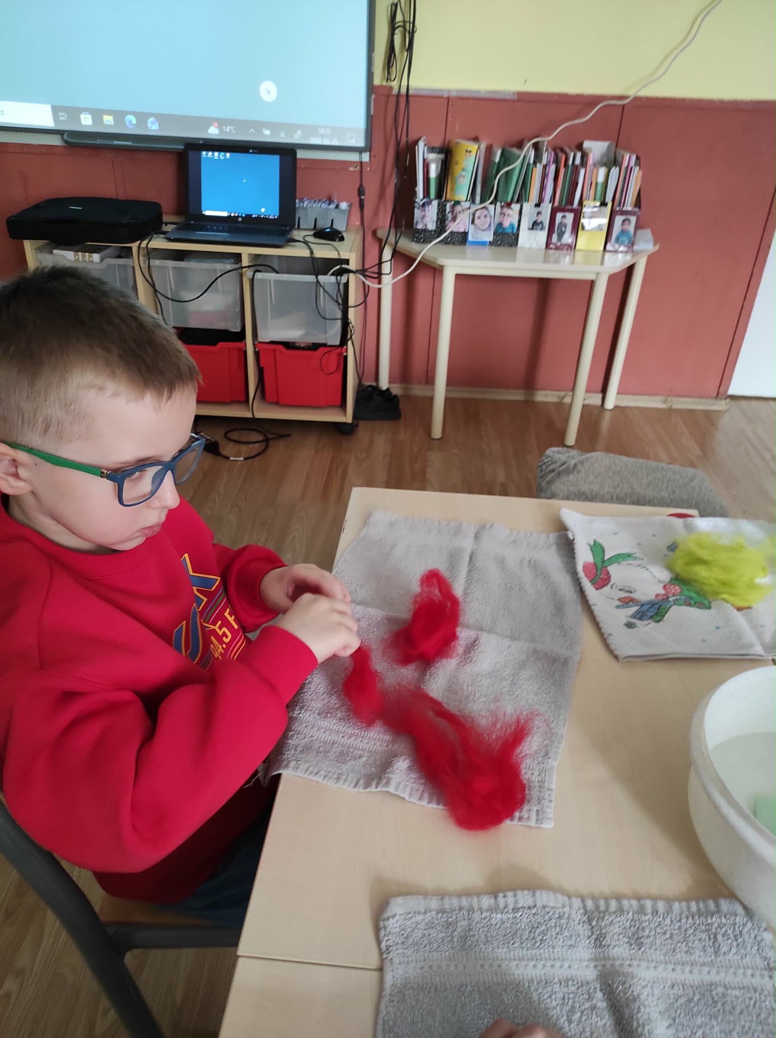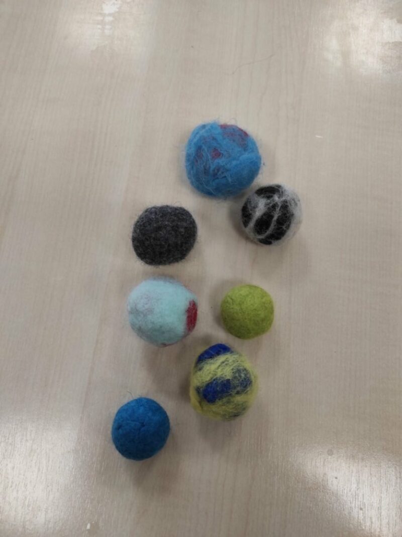 Megismerkedtünk a gyapjúval, labdát „söndörgettünk” belőle. A gyerekek meglepődve és csodálattal kísérték végig a fonal keletkezését a bárány nyírásától a kézbe vett pihe-puha gyapjúig. „Jó érzés simogatni a kezemmel” mondták. Aprók között hatalmas öröm volt ezt megtapasztalni!