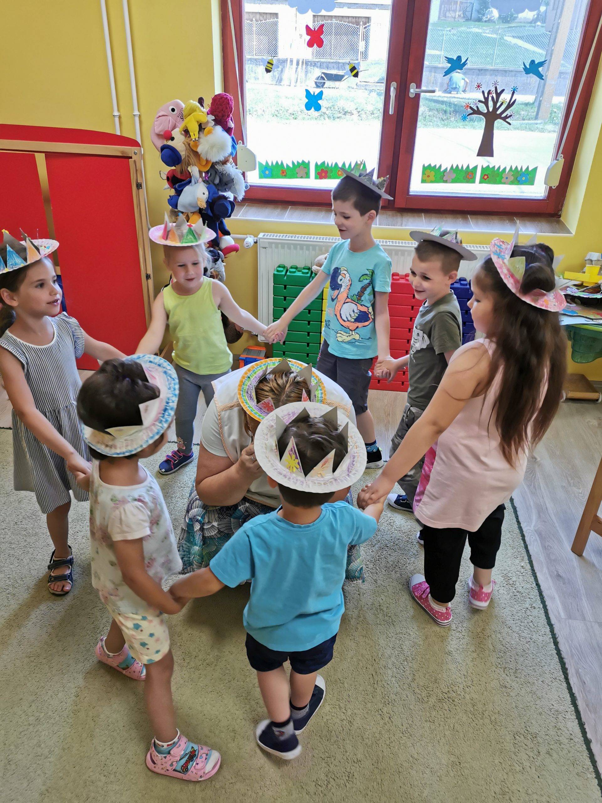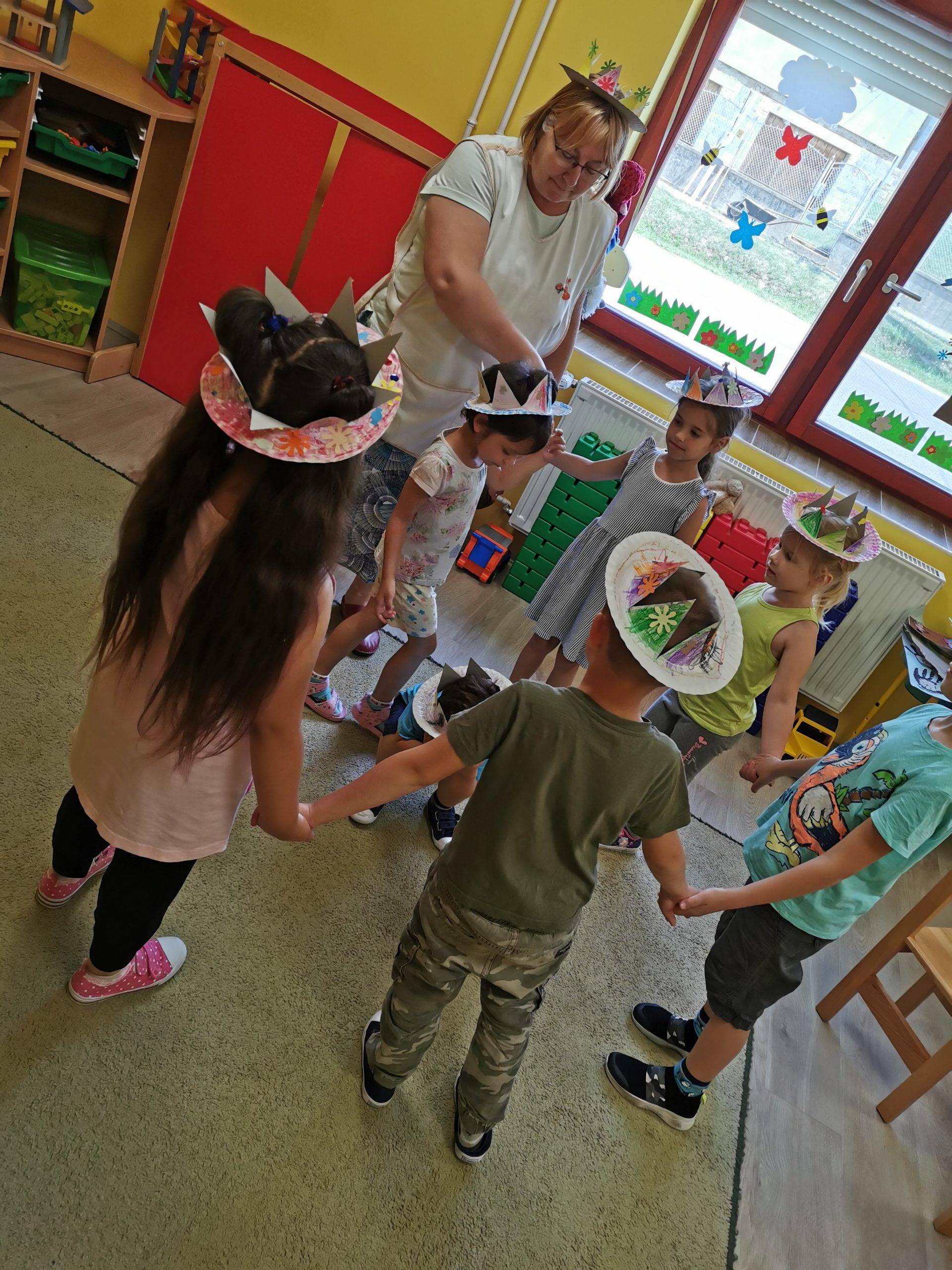 A mese után beszélgettünk, felkeltette az érdeklődésüket a történet, többen vissza tudták idézni a kérdések alapján. A témát korona készítéssel vittük tovább, illetve zártuk le. Az elkészült koronákkal maguk kezdeményeztek dalos játékokat, így kihasználtam a lehetőséget a spontán játékokra.