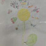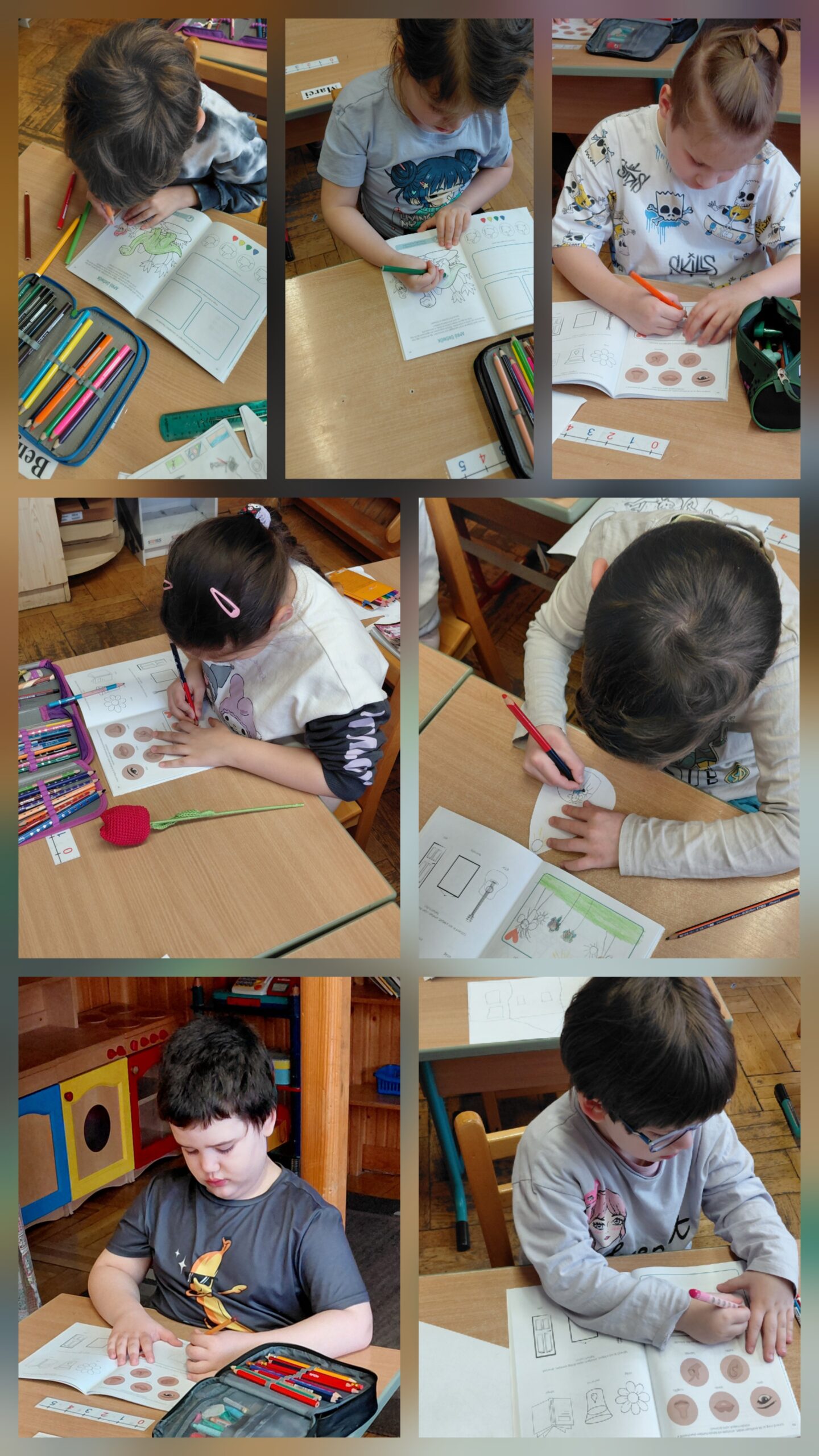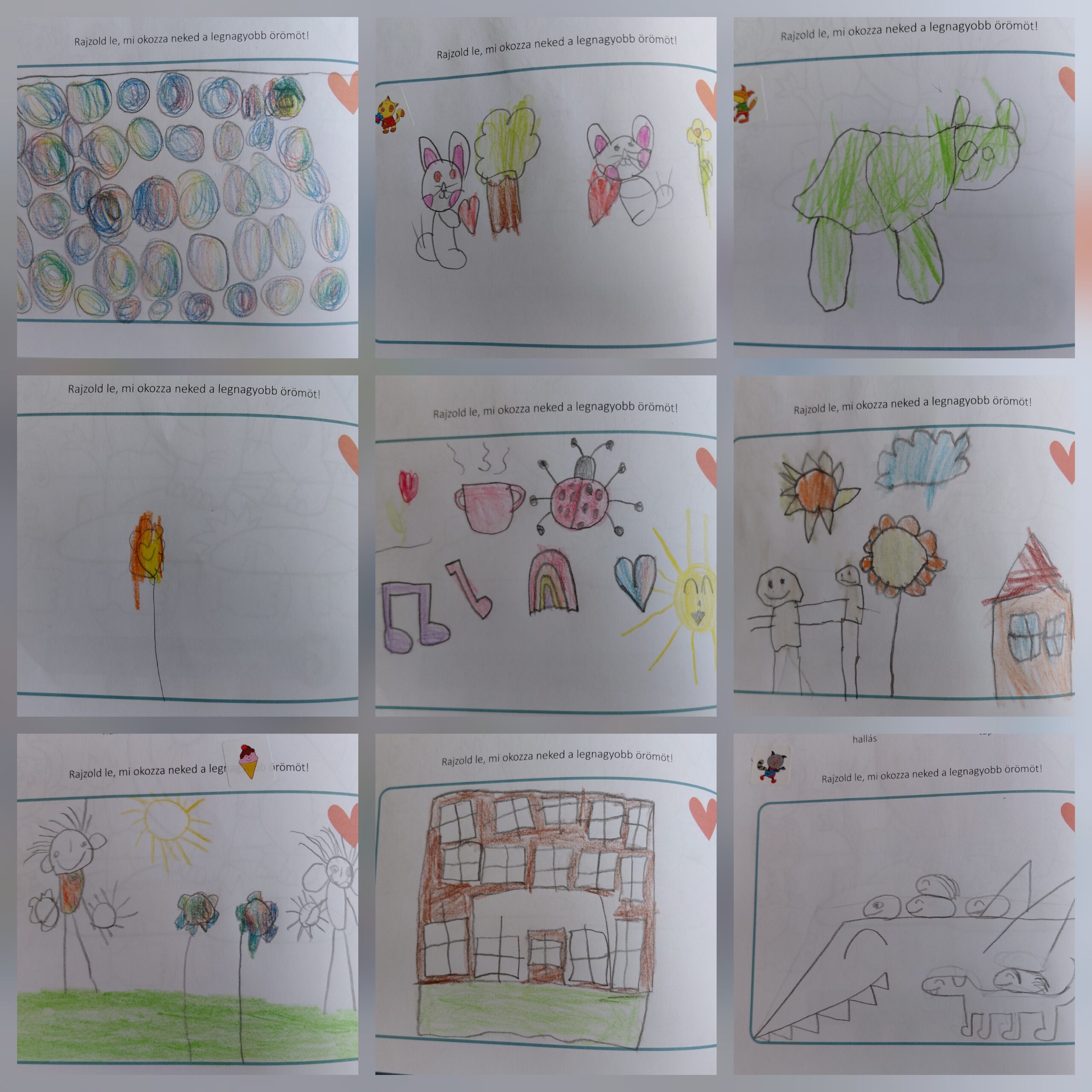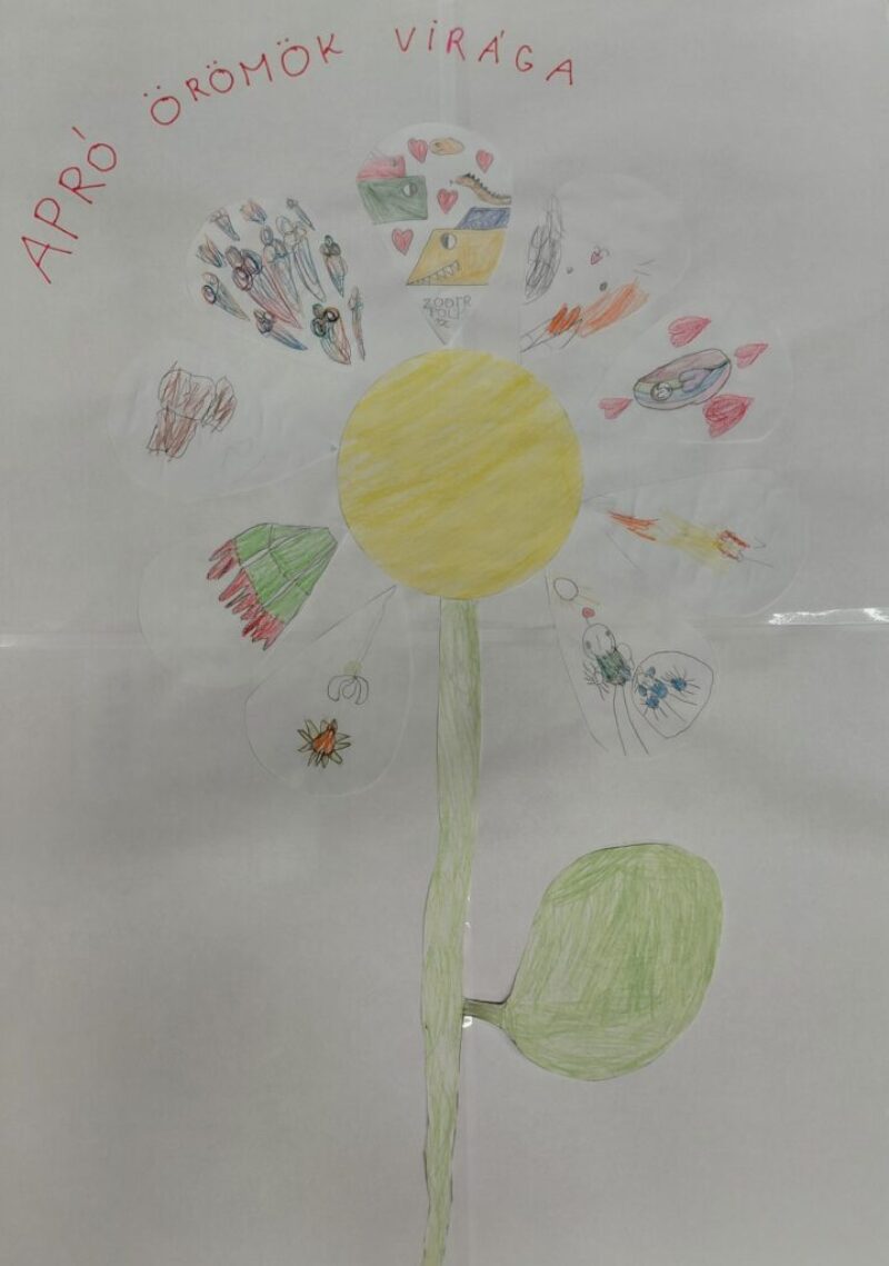 A foglalkozást az arcizomlazításos gyakorlattal kezdtük, ami nagyon jó kedvre derítette a gyerekeket. Ezután meghallgattuk a hónap dalát, megbeszéltük, kinek mi okoz örömöt, mitől lesz jobb kedve. Nagyon kedves dolgokat mondtak, pl.: a kutyusával való játék, villamosozni, az újszülött kistestvére, fagyizás, madárcsicsergés, iskolába járás. Ezután beszélgettünk az érzékszerveinkről, melyeknek köszönhetően élvezhetjük a mindennapok örömeit. A gyerekek a munkafüzetbe lerajzolták, mi okozza nekik a legnagyobb örömöt, majd elmeséltem Pirinkó és Góliát történetét, ami nagyon tetszett a gyerekeknek. Ezután elkészítettük közösen az apró örömök virágát. Mindenki készített egy virágszirmot, az egyik kisfiú pedig elkészítette a virág szárát. Gyönyörű lett a végeredmény, fel is tettük a falra. A foglalkozás végén még kiszínezhették a gyerekek a munkafüzetben a meséhez tartozó rajzot, és feltettük a Boldogság Várának lépcsőjére az apró örömök jelét. Nagy boldogsággal tapasztaltam, hogy milyen változatos dolgokat mondtak örömforrásnak a gyerekek, és egyikük se mondta a telefonnal való játékot, mint örömforrást.