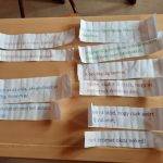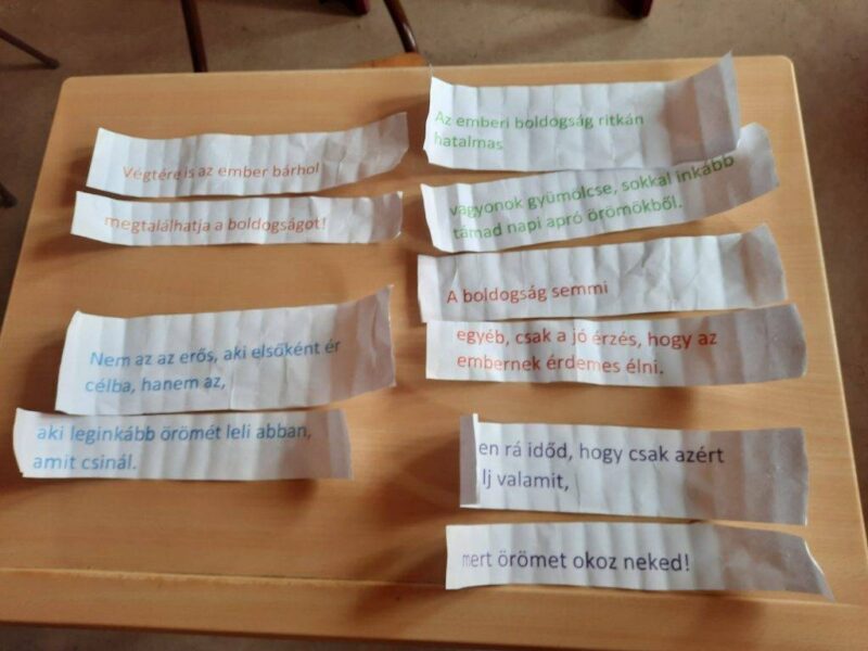 A gyerekek színes feliratokat tartalmazó cédulákat kerestek az iskola területén. Ezeket összeillesztettük értelmük szerint és hangosan felolvastuk. Az ebben az évben megtartott foglalkozásokból válogattam fotókat, amelyeket feldaraboltam és ki kellett rakni a puzzle-t, majd ki kellett találni, mely témához kapcsolódnak a képek. Az osztályt kettéosztva a pozitív érzelmek versenyét rendeztük meg. Ki tud mennél több érzelmet felsorakoztatni: pl. érdeklődés, kíváncsiság, öröm, lelkesedés, büszkeség. A következő feladat címe a társas támogatás volt: Kivel ápolsz olyan viszonyt, amelyből segítséget, támogatást, vagy vigaszt nyerhetsz? Hogyan tudnád ezt a boldogságfokozó tevékenységet megerősíteni? A támogatók körének növelésével, a jelenlegi kapcsolatok megerősítésével, vagy mindkettővel, esetleg más dologgal? Új magatartásformák szokássá válása volt a következő téma. Volt –e már bármilyen fogadalmad, új szokásod, amelyet részben vagy egészben sikerült egy vagy több hónapig, esetleg tovább is fenntartani? Éves kérdőívünket készítettem el, amelyről párbeszédet kezdeményeztem a gyerekekkel a tanéves élményeikkel, tapasztalataikkal kapcsolatban: