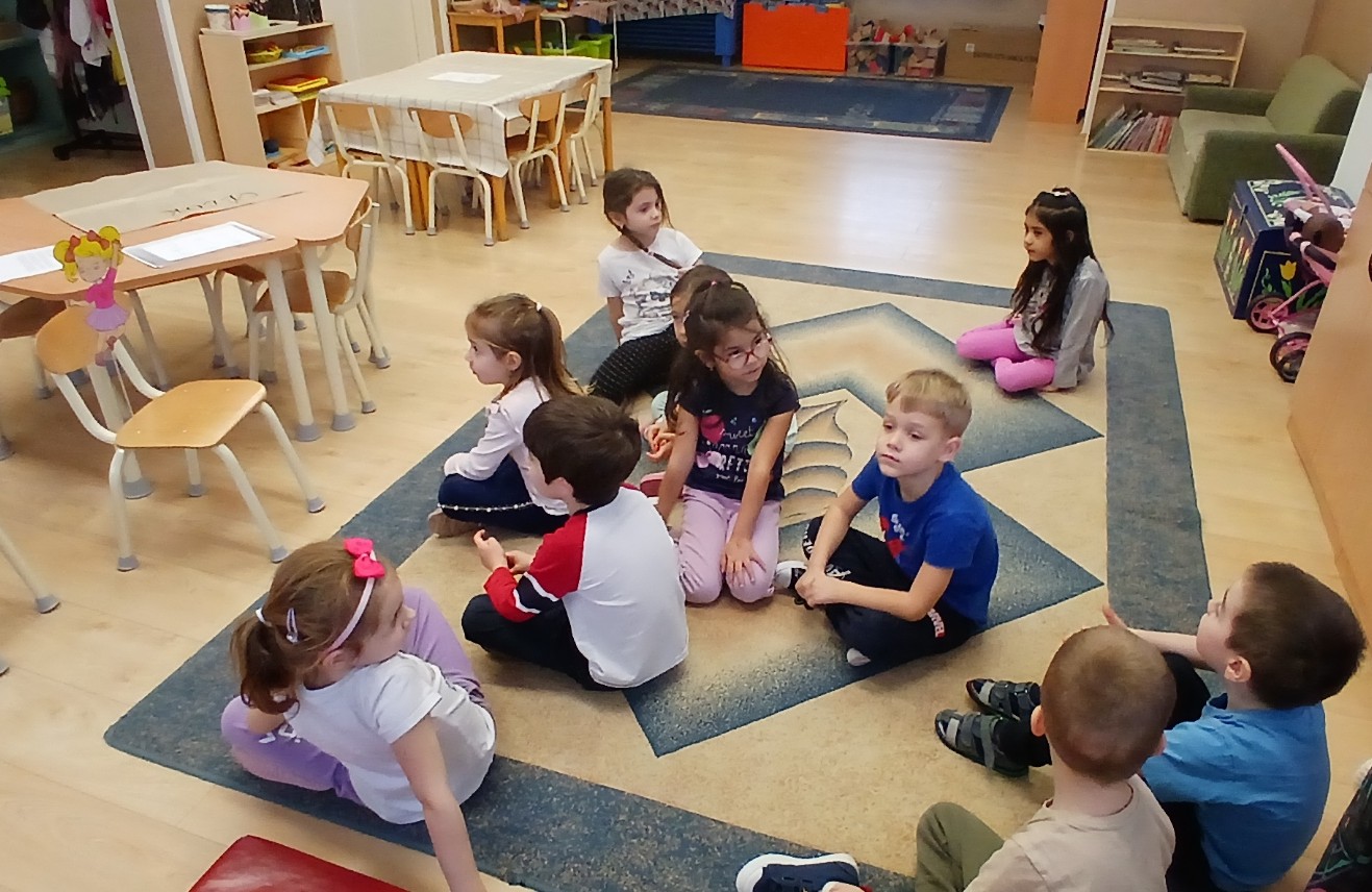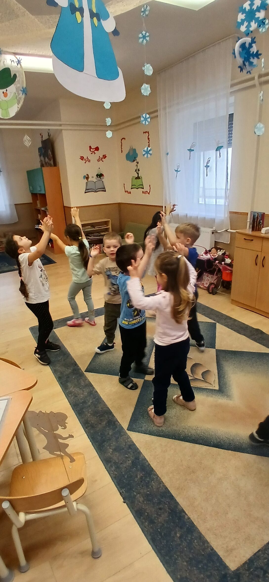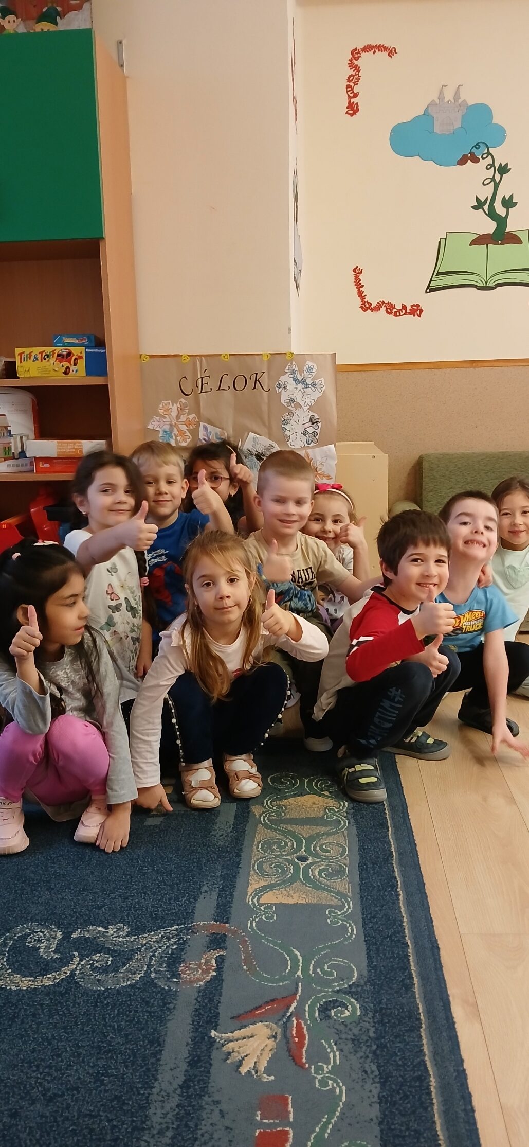 A tevékenységet relaxációval kezdtük (puha meleg, felengedek, meleg vagyok, elolvadok) amelynek célja a gyermekek figyelmének összpontosítása és a tevékenységre való ráhangolódás elősegítése, valamint a testi – lelki egyensúly kialakítása. Lassan, csendes légzéssel és mozdulatokkal a gyerekek ellazultak, figyelmüket saját testükre és érzéseikre irányították, ezáltal megteremtődött a nyugodt, befogadó légkör a beszélgetéshez és a további kreatív tevékenységekhez. A relaxáció lehetőséget biztosított a gyermekeknek, hogy belső élményeikre koncentráljanak, és nyitottan kapcsolódjanak saját vágyukhoz. Ezt követően a gyerekekkel körbe ültünk, majd elmondták, mit szeretnének nagyon elérni, mire vágynak. A pedagógus támogató irányítása mellett minden gyermek lehetőséget kapott saját céljának megfogalmazására, miközben a csoporttagok figyelme és empatikus attitűdje is erősödött. A beszélgetés segítette a társas készségek, az önkifejezés és az érzelmi tudatosság fejlődését, hiszen a gyermekek megtapasztalhatták, hogy vágyukat a csoport elfogadja és értékeli. A beszélgetést követően mese következett, amely szintén az álmok és célok témáját dolgozta föl. A történet főhőse egy állat volt, aki hosszú utat tett meg, kitartott, és végül elérte vágyát. A mese során a gyermekek azonosulhattak a főszereplővel, átélhették a cél elérésének örömét, és megtanulhatták, hogy a vágyak elérése türelemmel, kitartással és kreatív megoldásokkal lehetséges. Ezután következett egy élményszerű gyakorlat, a „séta a hóesésben”, ahol a gyerekek varázshópelyheket kaptak, és mindenki elmondhatta, mire vágyik, mit szeretne legjobban. A játék mozgásos élménye lehetővé tette, hogy a gyermekek játékosan fejezzék ki kívánságaikat, és megtapasztalják a kreatív vágykifejezés örömét. A séta során a gyerekek mozgása és a közös élmény erősítette a csoportkohéziót és az együttműködést. Ezután a gyermekek hópelyheket színeztek, vágtak és ragasztottak, valamint a munkafüzet 38. oldalán található színezőt is kiszínezték, akiknek kedve volt hozzá. A kreatív tevékenységek a finommotorika és a vizuális észlelés fejlődését szolgálták, valamint lehetőséget adtak a vágyak vizuális megjelenítésére és a sikerélmény átélésére. A színezés és ragasztás önkéntes formája az önállóságot és az önszabályozást is fejlesztette.