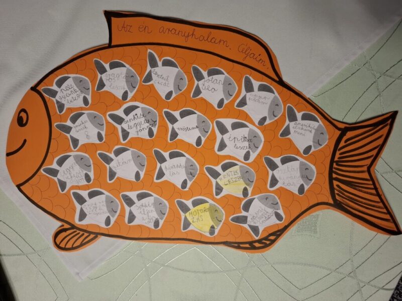 A téma feldolgozása során a gyerekek nagyon ügyesen fogalmazták meg egyéni céljaikat. Sikerült az osztályközösségre vonatkozóan is célokat kitűzni. A mese sokat segített a téma megértésében. Utána nagy igyekezettel készítettük el az aranyhal tablót.