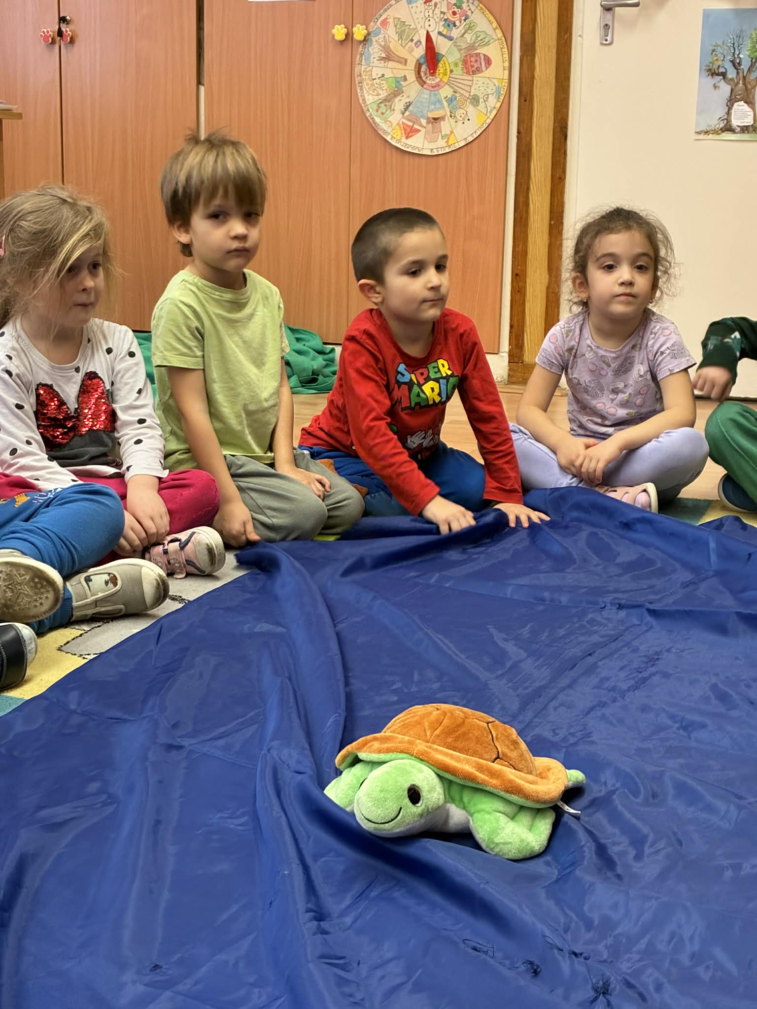 A játék során a gyerekek az önszabályozás lehetőségeit gyakorolhatták testmozgáson keresztül, valamint segített számukra a test-érzelem kapcsolat felismerésében, impulzus kontroll gyakorlásában, valamint a társas kapcsolódásban. Ezt követően visszamentünk a „tengerpartra”, és „Teknősbéka-pihenőt” tartottunk-relaxációs gyakorlat keretében.