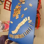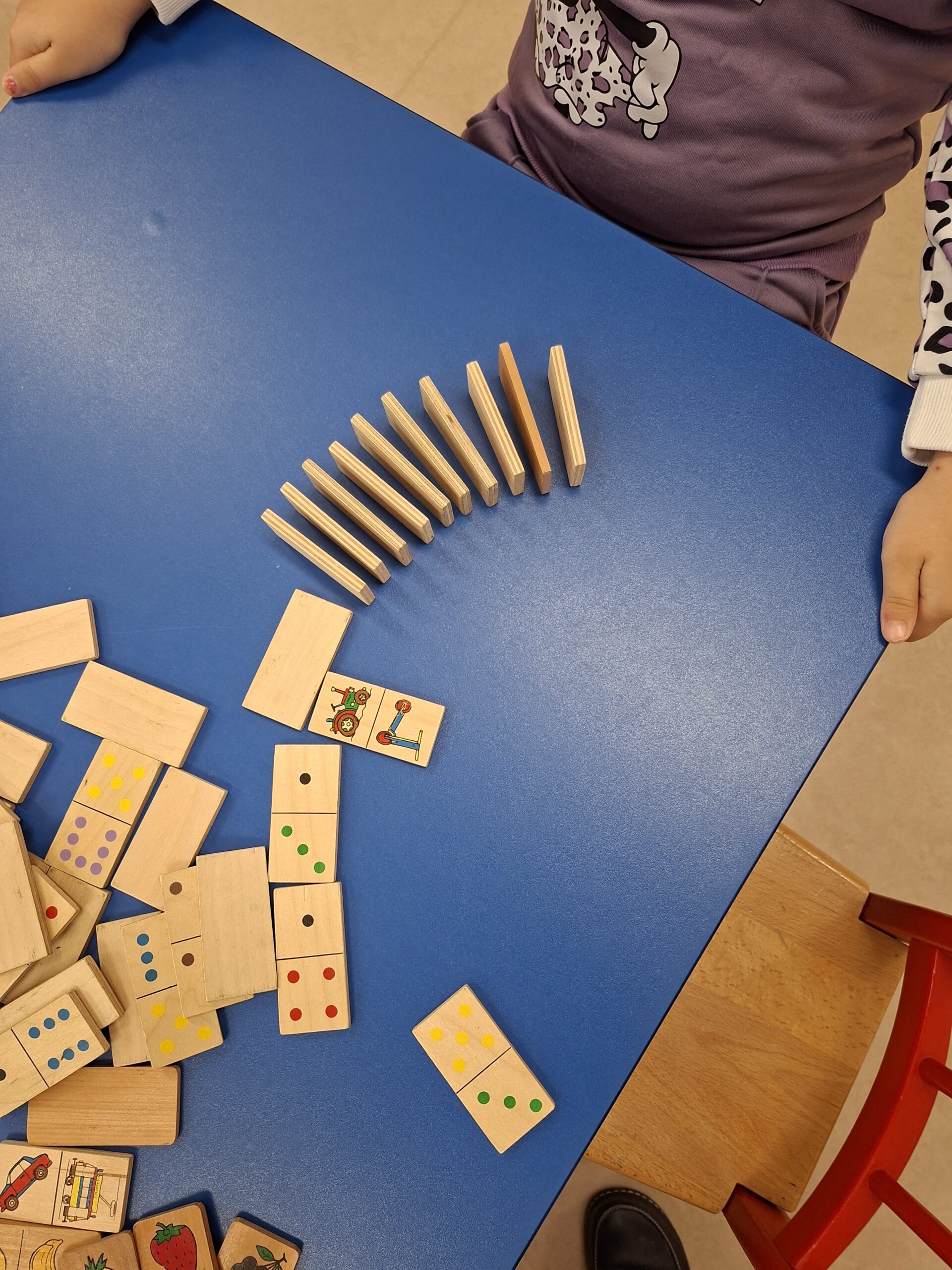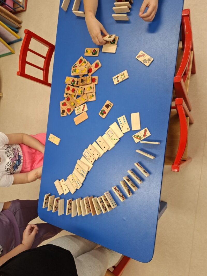 A dominó napon a gyerekek nagyon lelkesen építettek különböző tornyokat a dominóból. A Tavaszi ébresztő mese tetszett a csoportnak, de a kérdéseknél kiderült igen kevesen járnak erdőbe kirándulni. Mik vannak az erdőben azt tudták, hogy fák és állatok. Barlangot nehezen tudták elképzelni, nincs tapasztalatuk. A hangya ha szaladna rajtuk, többen megjegyezték, hogy nem szeretnék, félnek. A tenyerüket körbetudták rajzolni, de nem túl kreatívak, nem nagyon sikerült belerajzolni. A csoportnak sok segítség kellett a megvalósításokhoz.