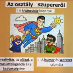 Superman figurájából kiindulva megalkottuk az osztály szupererő tablóját: a kíváncsiság köpenyét, a hála ruháját, a humor és szeretet csizmáját, a kreativitás, az alázat, a társas intelligencia és a kedvesség övét, a remény és a csapatmunka emblémáját viseli a mi szuperhősünk.