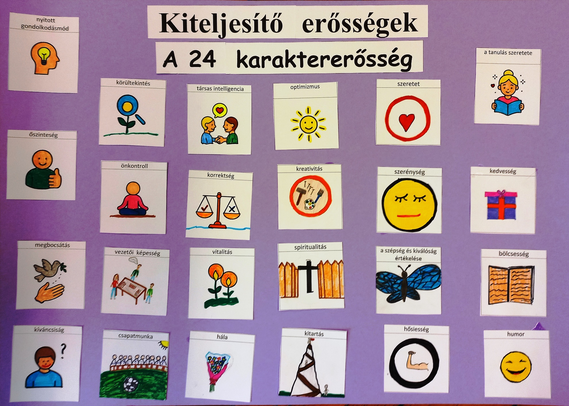 Az első foglalkozást a Szívmanó nyugilégzés kártyán található két gyakorlattal indítottuk, hogy a stresszes, pörgős mindennapjaikból megérkezzenek a boldogságórára. Célzott kérdésekkel felelevenítettem ismereteiket az erények és erősségek témában. Ezután a tavaly elvégzett VIA-teszt eredményei alapján felolvastam egy-egy tanuló 5 legfontosabb erősségét, és magukra kellett ismerniük. Nem mindenkinek sikerült, de a gyerekek segítettek egymásnak. Azon is elgondolkoztak, hogy most, egy év elteltével mennyiben változtak, rendeződtek át ezek az erősségeik, jelentek-e meg újak a listájukon. Ezután megrajzolták egy-egy erősség szimbólumát, ők hogyan jelenítenék meg, így elkészült a mi karaktererősség-tablónk. Mivel nem vagyunk annyian, ahány karaktererősség van, a kimaradt erősségekhez és kerestem szimbólumokat a következő órára, ők pedig kiszínezték.