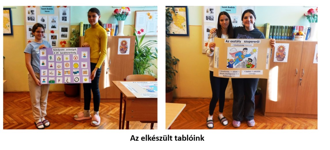 Az előző tanévben a Boldogságóra Erősség Program keretében megismerkedtünk a 24 karaktererősséggel, megállapítottuk, kinek mi az öt legfontosabb erőssége, és ezek alapján felállítottuk az osztály öt fő közös erősségét is. Így a november havi téma már ismerősként köszöntött ránk. Emlékeztetőül és segítségképpen mindhárom foglalkozáson ott volt előttük az erények és erősségek táblázata kinyomtatva. A foglalkozásokon arra figyeltünk, hogy megtaláljuk a kapcsolódási pontokat a karaktererősségek és az önbizalom fejlesztésének lehetőségei között.