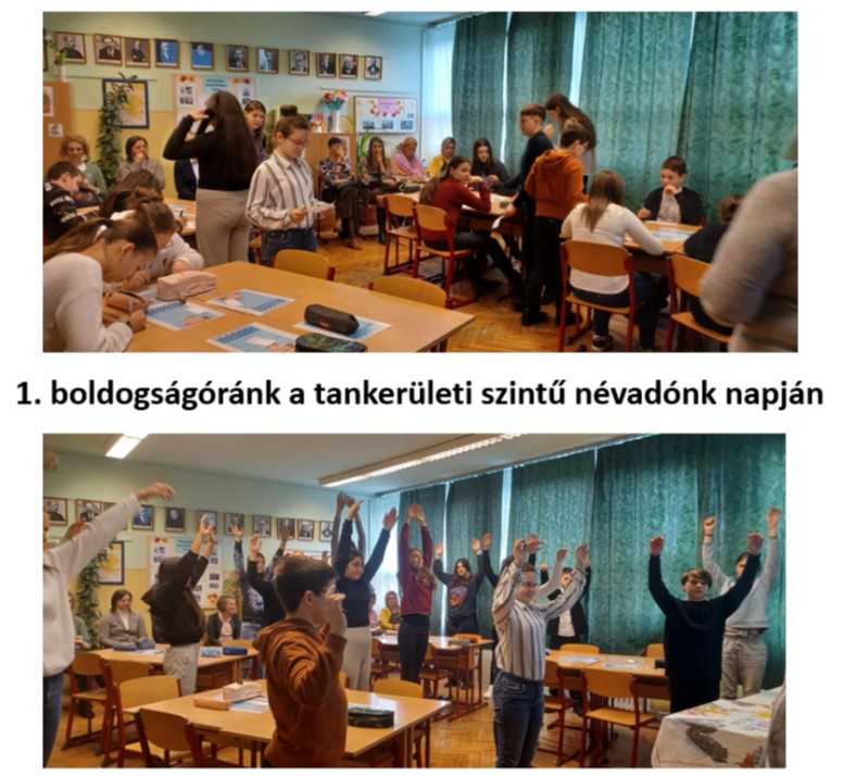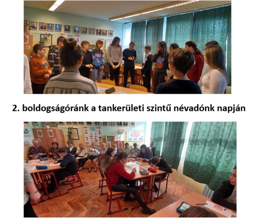 November 20-án intézményünk kiemelt jelentőségű jubileumi eseményt ünnepelt: 25 éve vette fel az iskola Sári Gusztáv tanár és tankönyvíró nevét. A tankerületi szintű rendezvényen sor került bemutatóórákra is, így két boldogságórás foglalkozást is megtekinthettek az érdeklődők, melyeket én tartottam a csoportomban. A két csoportfoglalkozás célja az volt, hogy megmutassam, hogyan lehetséges az Önbizalom Program segítségével a tanulók személyes erősségeinek tudatosítása, az önbizalom fejlesztése, a pozitív pszichológiai szemlélet erősítése és az osztályközösség kohéziójának támogatása. Változatos feladatokkal bizonyítottuk, hogy a boldogságórákon tényleg a boldogság kerül a fókuszba. A foglalkozáselemek között voltak nyugilégzés-gyakorlatok, táncos aktivizáló feladatok, erősségek beazonosítása rövid animációs filmek segítségével, egymásnak erősségek küldése labdajáték segítségével, erősséghátizsákba célok és erősségek gyűjtése, erősségfelfedező kérdőíves játék. Ismét nagy sikert arattak azok a feladatok, amelyeket az Ez vagyok én, a Pozitív gyerek vagyok, a Szívmanó és a Szupererő kártyajátékok segítségével valósítottunk meg. A rendezvény ideje alatt a folyosón egy kisebb kiállítást rendeztünk be, amely az elmúlt két tanév boldogságórás tablóit, valamint az alkalmazott szakmai eszközöket (könyveket, társasjátékokat és kártyacsomagokat) mutatta be. A vendégek számára ez átfogó képet adott a program módszertani sokszínűségéről és pedagógiai értékéről. A bemutató-foglalkozásokat és a kiállítást megtekintő pedagógusok és szakmai vendégek visszajelzései egyértelműen megerősítették, hogy a boldogságórák módszertana jól illeszkedik az iskolai nevelő-oktató munkába, a program hozzájárul a tanulók érzelmi, szociális és személyiségbeli fejlődéséhez, és helye indokolt az intézményi gyakorlatban.