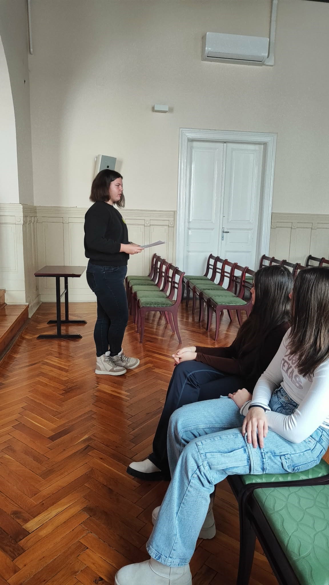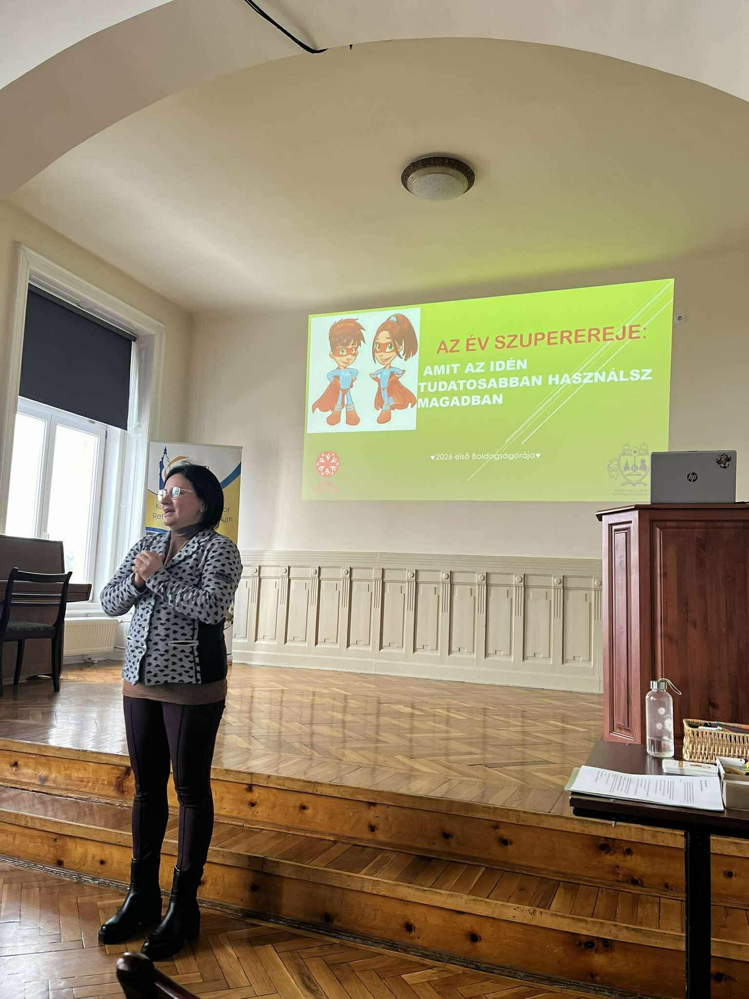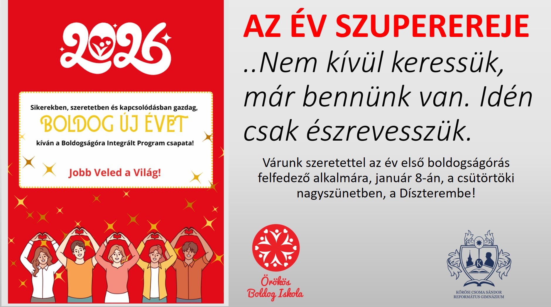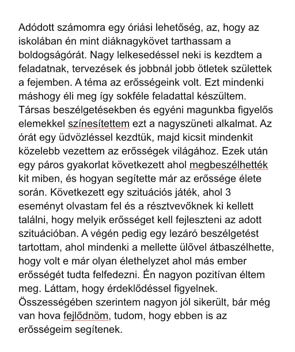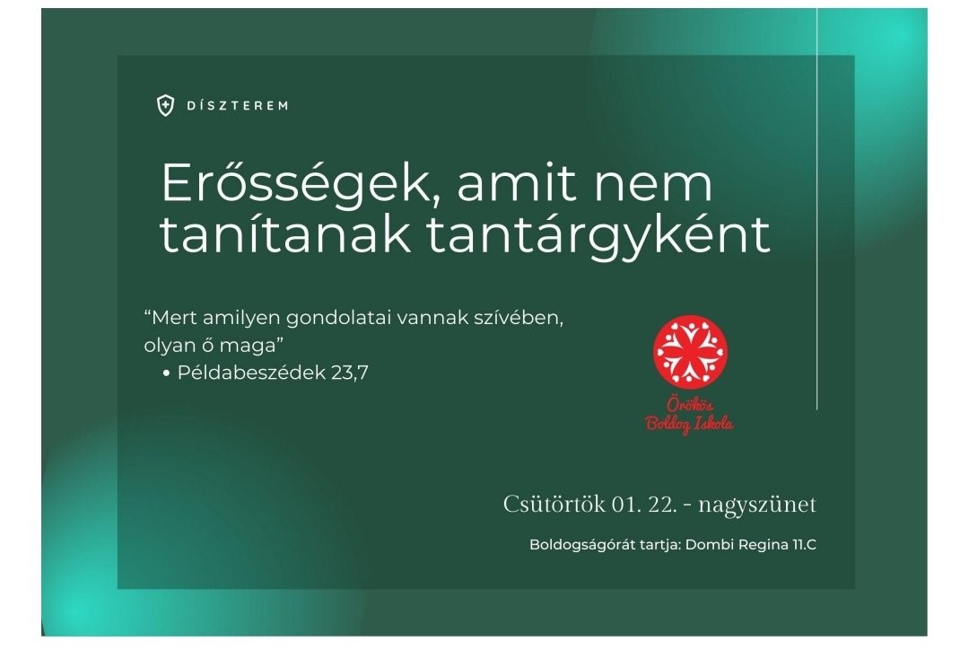 „Január 22-én, rendhagyó boldogságpercek töltötték be a díszterem légkörét a nagyszünetben. Dombi Regina -jómagam- boldogságóra diáknagykövet vállalásaként álltam ki a diákok és tanárok elé, hogy levezényeljek egy 10 perces instant boldogságórát, ami az erősségek gyakorlásáról, képességekről szólt többek között. A közönség bevonása, megmozgatása mellett fényt derítettünk arra, hogy mennyire különbözőek vagyunk és hogy ez egyáltalán nem probléma, hanem igenis jó dolog. Egyéni fejlesztő, motiváló játékként végig kellett gondolniuk a közönség tagjainak, hogy az elkövetkezendő napban melyik képességüket fogják felhasználni ahhoz, hogy valami jót tegyen a saját vagy esetleg egyik társuk napjában. Közösen megtanultuk, hogy az értékeink igazán akkor válnak értékessé, ha ezeket rendszeresen gyakoroljuk és mások felé kimutatjuk őket.”
