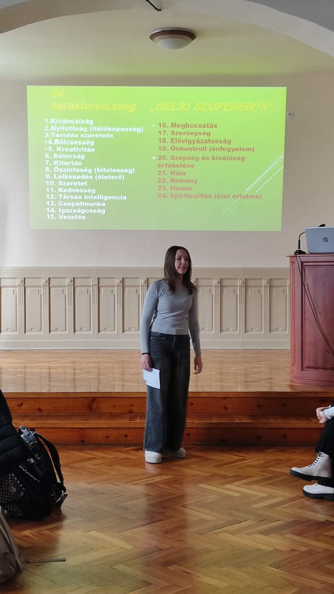 A tárgyak szupererejének megfejtése után felvezetésre került a 24 karaktererősség, amit ki is vetítettem. Megbeszéltük, hogy mindenkiben megvan mindegyik, csak különböző mértékben.