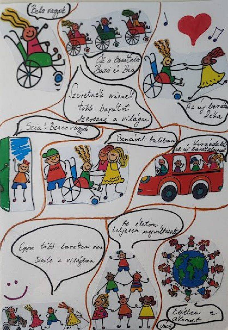 A Református EGYMI Kiskunhalasi Tagintézményének fejlesztő iskolás Oliva csoportjába járó tanulókkal ebben a hónapban a Célregény feladatot választottuk. Mi a képregényünket ragasztás technikával készítettük, mivel a gyerekek képességihez mérten csak így tudtok megvalósítani a feladatot. Mivel nálunk 3 tanuló is kerekesszékes, így a történetünk főszereplője is egy mozgássérült lány. Az ő célja, hogy sok új barátot szerezzen magának, amit végül sikerül is elérnie.
