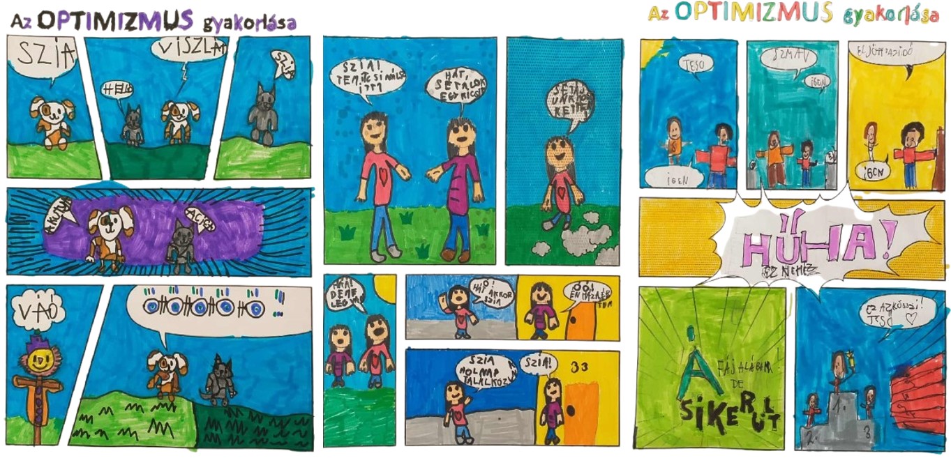 A téma bevezetésként felidéztük mindazt, amit az elmúlt évek során az optimizmusról tanultunk. Idén is két jóbarátunk, “Optimista Pista és Pesszimista Pál” segített nekünk abban, hogy összegyűjtsük azokat a tulajdonságokat, amelyeket érdemes magunkban erősíteni, mert segítenek átlendülni a nehezebb időszakokon, illetve kerülendő, mert csak akadályoz bennünket a boldogság elérésében. A gyerekek képregényeket terveztek és rajzoltak, amelyek központi üzenete az optimizmus fontossága volt. A csoportok felé az a kérés fogalmazódott meg, hogy a történetek megalkotásakor lehetőség szerint saját élményeikből merítsenek ihletet. A kész alkotásokat minden páros / csoport bemutathatta az osztály előtt, így megoszthatták egymással gondolataikat és tapasztalataikat is.