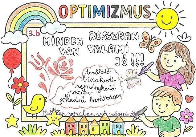 Októberi boldogságóráink középpontjában az optimizmus állt. Beszélgettünk arról, mit jelent optimistának lenni, és hogyan segíthet a pozitív gondolkodás abban, hogy könnyebben átvészeljük a nehezebb időszakokat. Meghallgattuk a hónap dalát, majd ismét végigjártuk a lépcsőket, hogy elolvassuk a motiváló idézeteket, amelyek mindennap erőt adhatnak a nehézségek és kihívások leküzdéséhez. Ezután képregényeket terveztünk és rajzoltunk az optimizmusról – sokan saját tapasztalataikból indultak ki, így minden alkotás személyes és különleges lett.